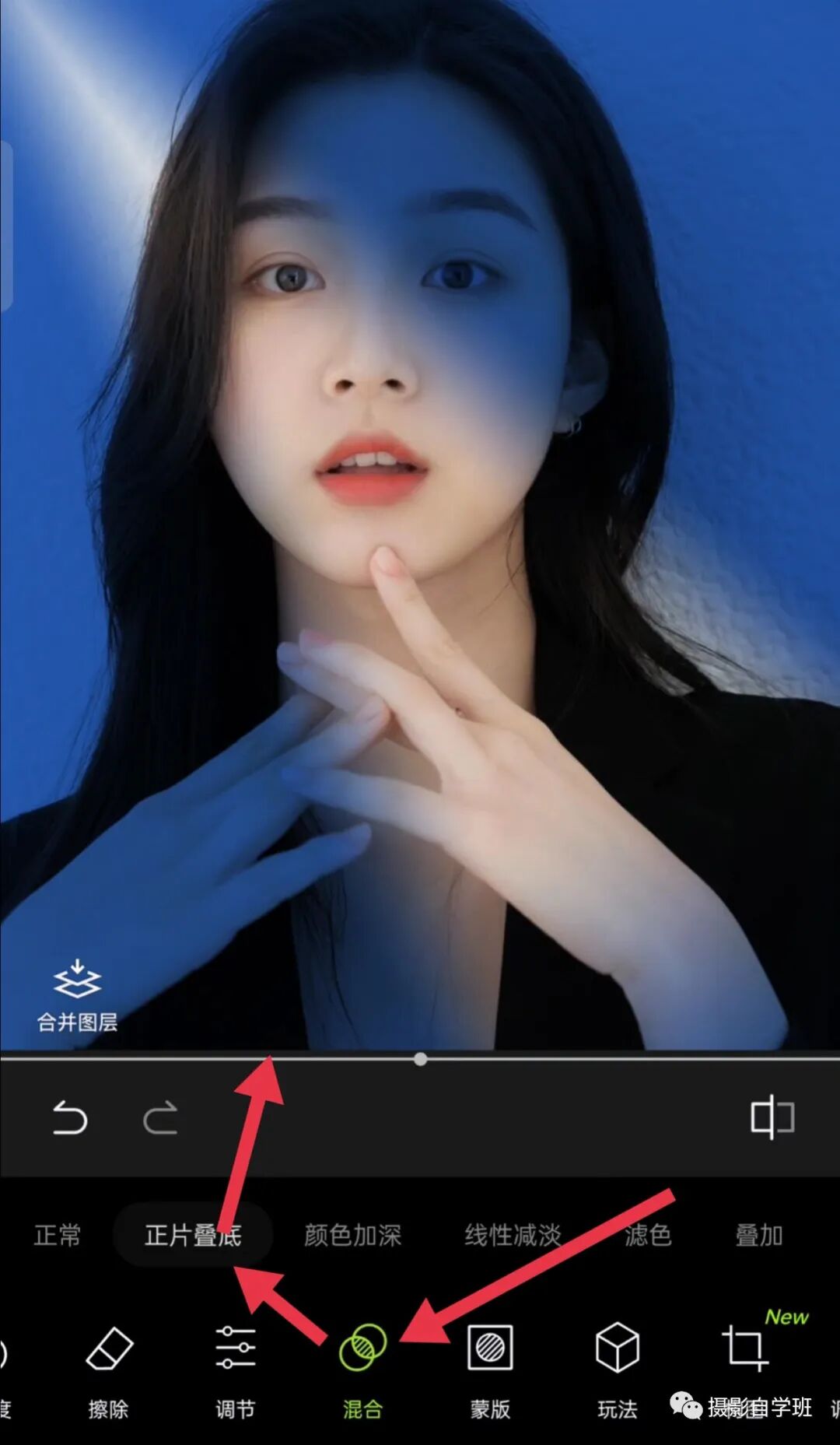再点击混合,在混合模式当中,选择正片叠底。这样人物面部有光,背景蓝色增加了照片整体的氛围,但还是不够。