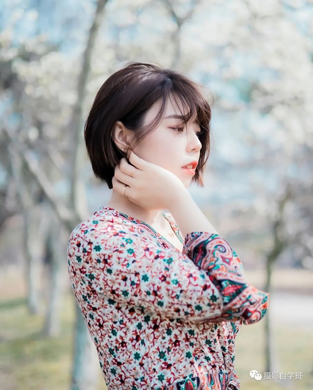 在拍摄人像摄影作品的时候,尤其是拍摄女士,不要让女士的双手放在腹部前,这样会让肚子相对来说显得很大,让人显得臃肿、不苗条,如果手没有摆放的地方,可以像下图这样,眼神看向前方地面,忧郁一点,一个手放到脖子上,就可以了。这个姿势看起来自然,不做作,还不会让人显得臃肿。