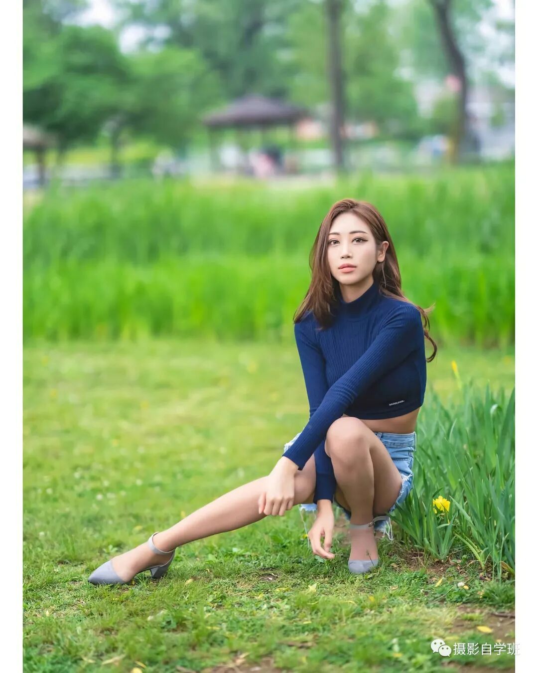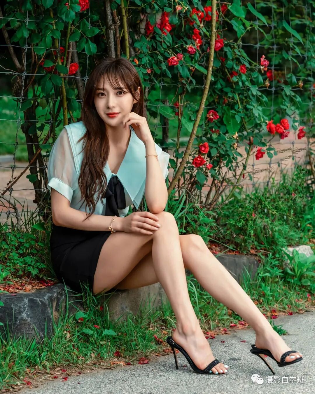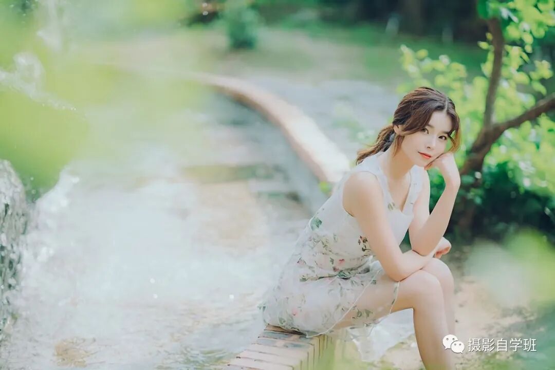 坐在马路边儿,两条腿前后错开,这样的姿势是对的。但是要把离镜头近的这条腿,向前伸,离镜头远的那条腿,抬起来。上面这张照片,两条腿摆放的姿势,正好摆反了。如果摆反了,会显得前腿大腿比较粗,就不那么美观了。我们也可以像下图这样坐着,坐在水池边上,用一些树叶遮挡作为前景排除层次感。