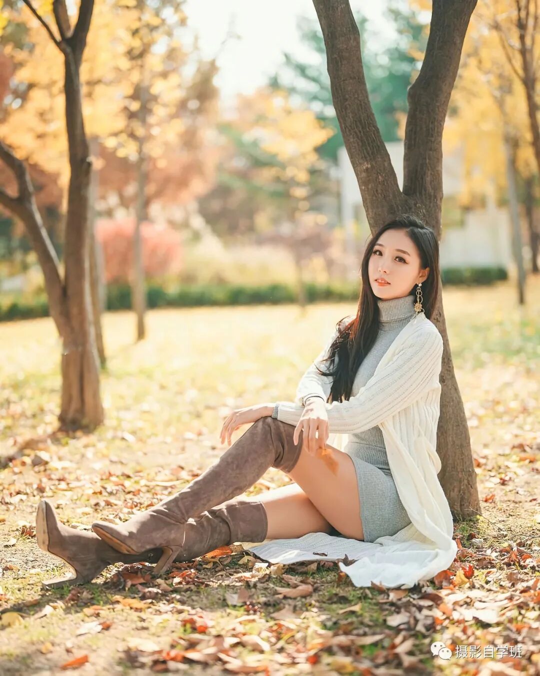 这个姿势面对镜头,会显得很尴尬。如果想蹲着拍,那可以侧身蹲着,这样姿势会更加优美。上图伸出来的腿,总给人一种不太舒服的感觉,被拍摄的模特,不舒服,看照片的人,也会不舒服。下面这张照片的坐姿,是正确的,但是头顶的树杈,如果为了幽默,是没有毛病的,但如果为了优美,要注意避开,不要在人的头顶上“长”出树杈。