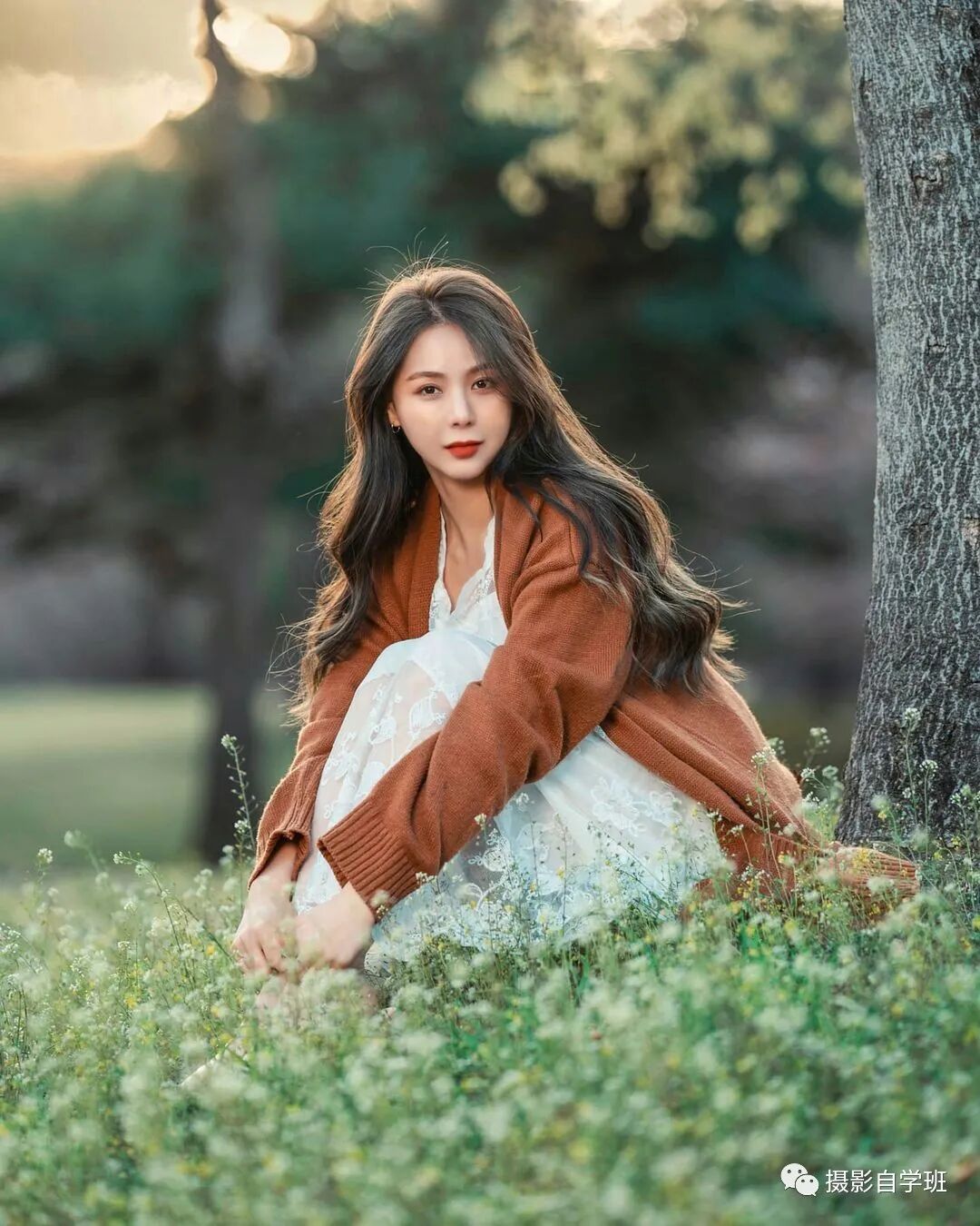 首先需要逆光,如果拍摄环境当中,没有合适的光,那可以自己准备灯,可以手持的LED灯棒也可以用支架。还有闪光灯。但是像上图这样,姿势很漂亮,一定不要让背景当中的灯,露出来。如果像下图这样,坐在草地上,可以把灯放在稍远的位置,让人的身体,挡住灯,照射在头发上,就有轮廓光了。