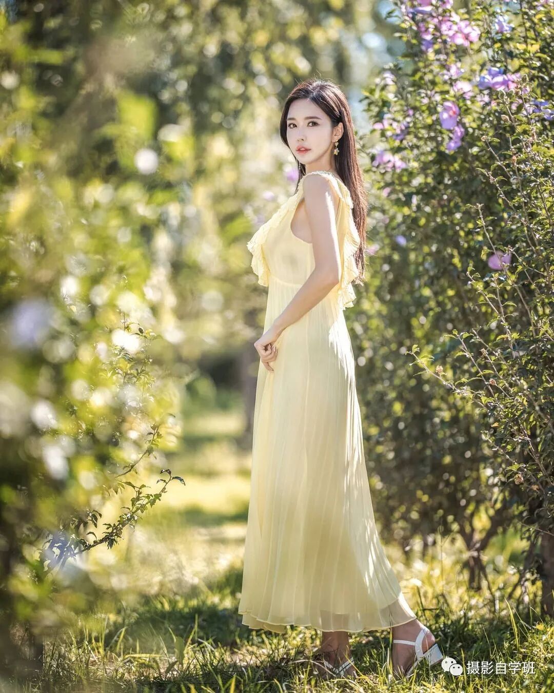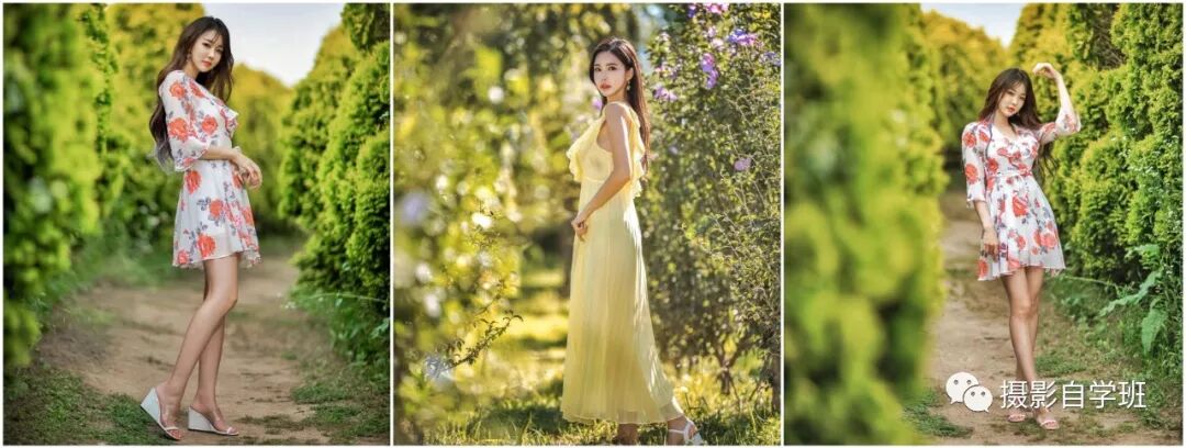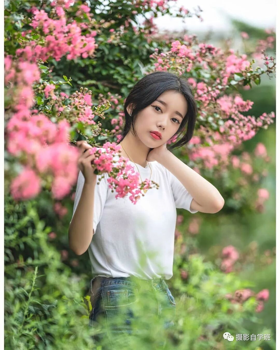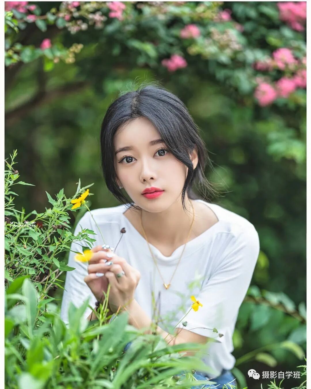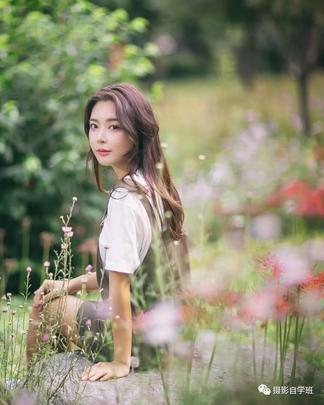 这个蹲姿,看起来不太雅观,而且从上往下的拍摄角度,让人看起来又矮又挫又小。而在花坛边,可以坐在花坛边缘的石头上,相机隐藏在花朵后面,这样对焦在人物的眼睛,挡住相机的花草,就能形成虚化的前景,人物一个回眸的姿势,自然又漂亮。模仿的时候,要注意一些细节,不只有回眸的姿势,还有一只手搭在膝盖上,另一只手拄在石头上。