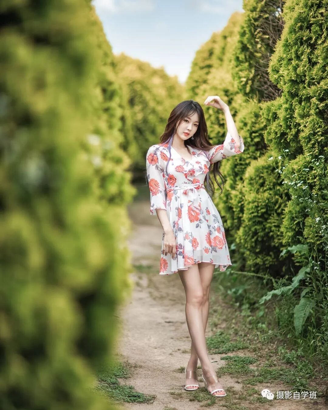 记住要缩小取景范围,当你把拍摄环境的范围,缩得很小时,照片当中,就有很多杂物被排除了,这样拍摄出来的画面,就会相对干净很多。可以在花墙下模仿上图,一个手放在脖子后面,一个手抓着花枝。还可以像下图这样。蹲在那里,但是用草,挡住腿以下的部分。