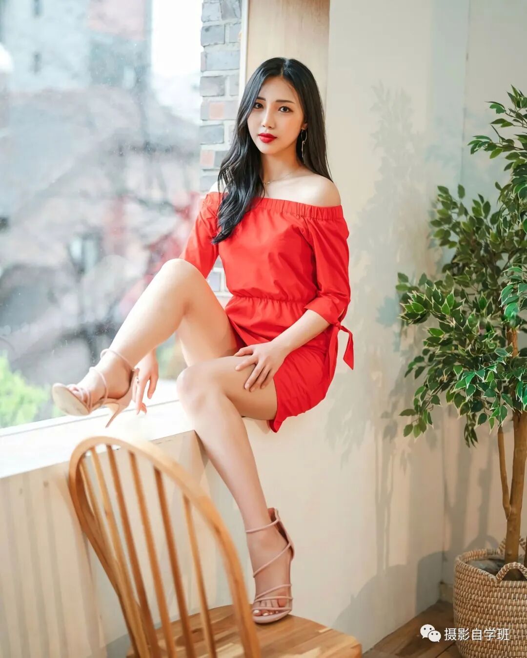 像上图这样,两条腿都弯曲的,必然不会把腿显得很长。而如果像下图这样,让人坐在画面中间,把腿伸向一个角落,对角线构图,可以让腿显得更长。