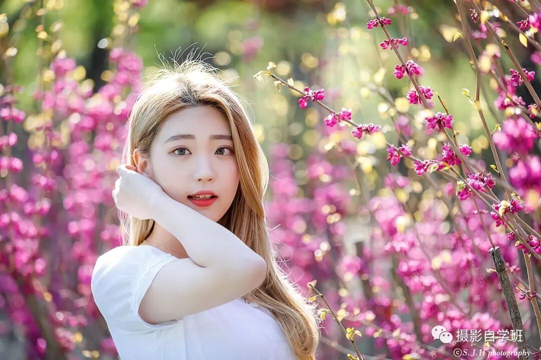 人不要站得过于直,而是可以像上图这样,拿着一些花草,端着胳膊,看向斜上角,或者像下图这样,歪着脑袋。如果直直地站着,姿势看起来很僵硬,照片就不好看了,而搭配上一些小的弯曲,就可以让照片看起来,更加自然优美。