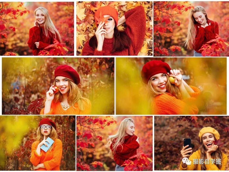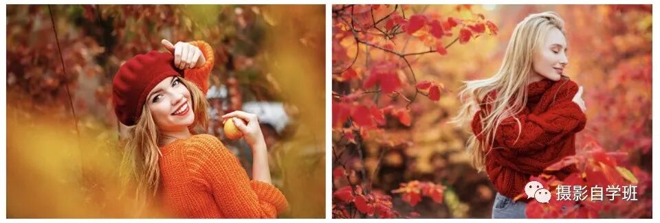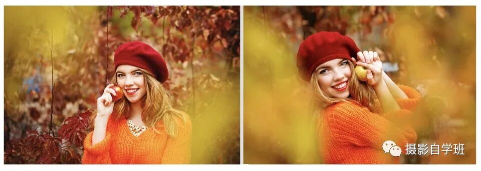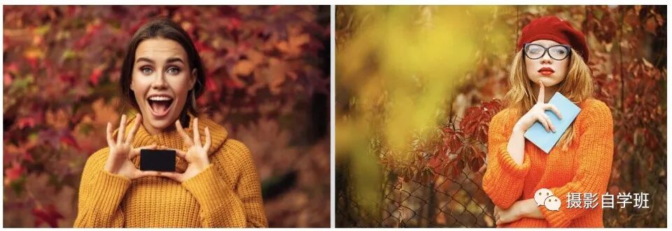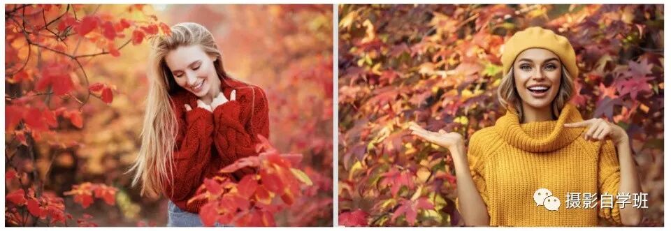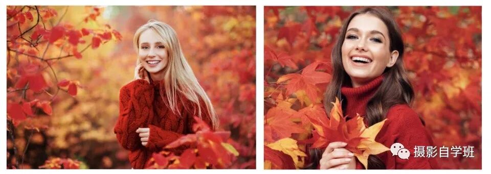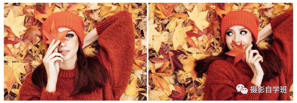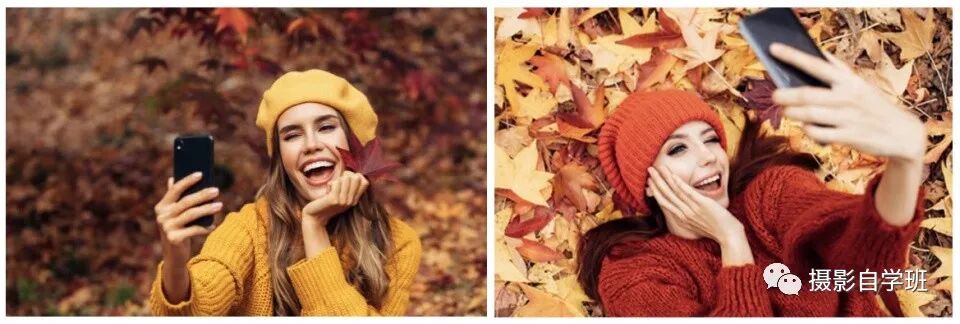 相信没有人会拒绝开怀大笑的人,因为笑容总是具有一定的感染力,让观者会不自觉地嘴角上扬,所以好多摄影师在拍摄的时候,都会让模特开心一些。但是我们注意图二的景别位置。左侧人物肢体语言比较丰富,拍摄前后有一定的空间感,但是右侧的人物,在画面中呈现的效果有些顶天立地,枫叶放到胸前,人物似乎缩到了一起,所以画面的整体就很紧,看似不够随意,我们在拍摄风景照片的时候,头部是一定留有空间的。
