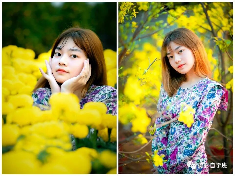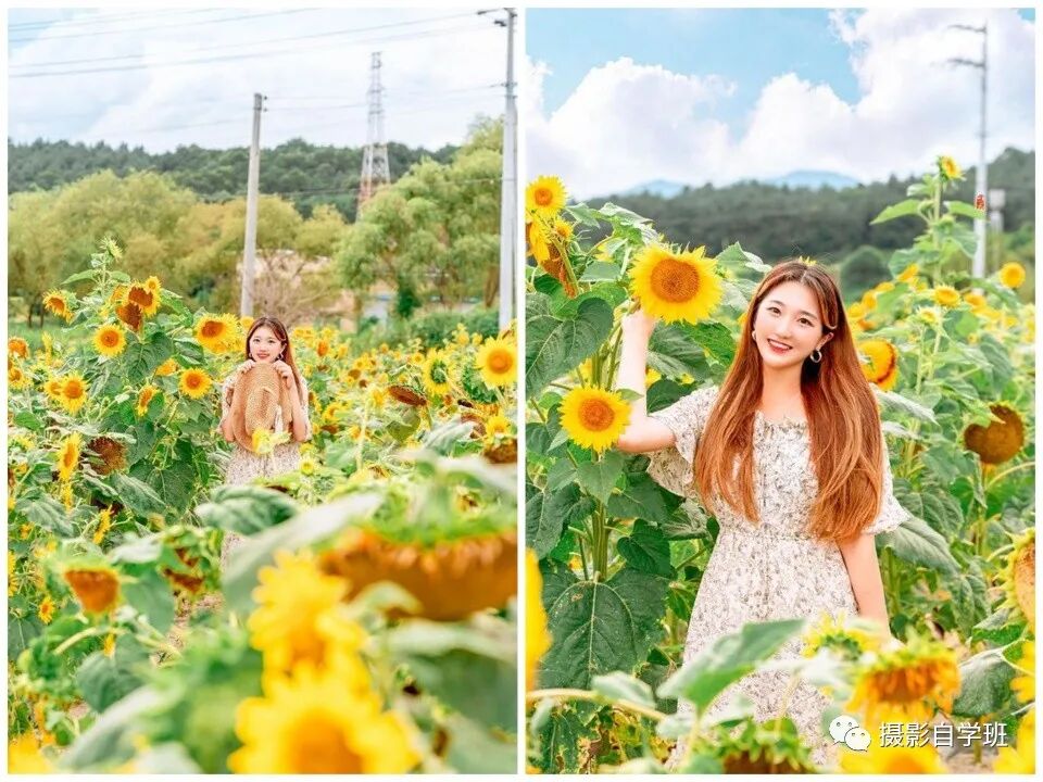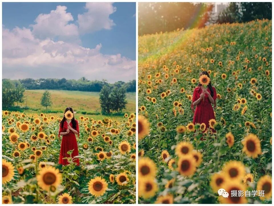 在向日葵中,用向日葵挡住面部,可以拍得非常含蓄。想拍出上图右侧这种光影,拍摄之前,拿掉镜头上的遮光罩,逆光拍摄,从取景器当中,或者从相机屏幕上,看到光影的时候,再按一下快门,光影就可以留在照片上了。