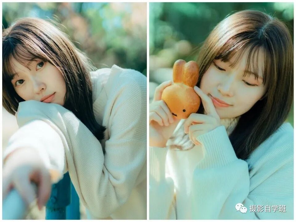 你说想拍摄一些面对镜头的照片,那怎么能不尴尬呢?这里主要的就在于,摄影师的引导与抓拍了。可以让她看镜头,把两个手扶在下巴上,但是要注意不要把下巴推变形。或者像上图右侧这样,适当歪个脑袋,就可以更显自然了。