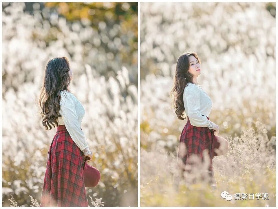 回眸的姿势很文艺,可以让人不看镜头,但是脸要多露出来一点,而不是像上图左侧这样,头发把脸挡的面积太大,右侧的这张就好了很多。用大光圈镜头,在下午3:00之后拍摄草地上的人,可以把草上放出来的光,拍成漂亮的光斑。