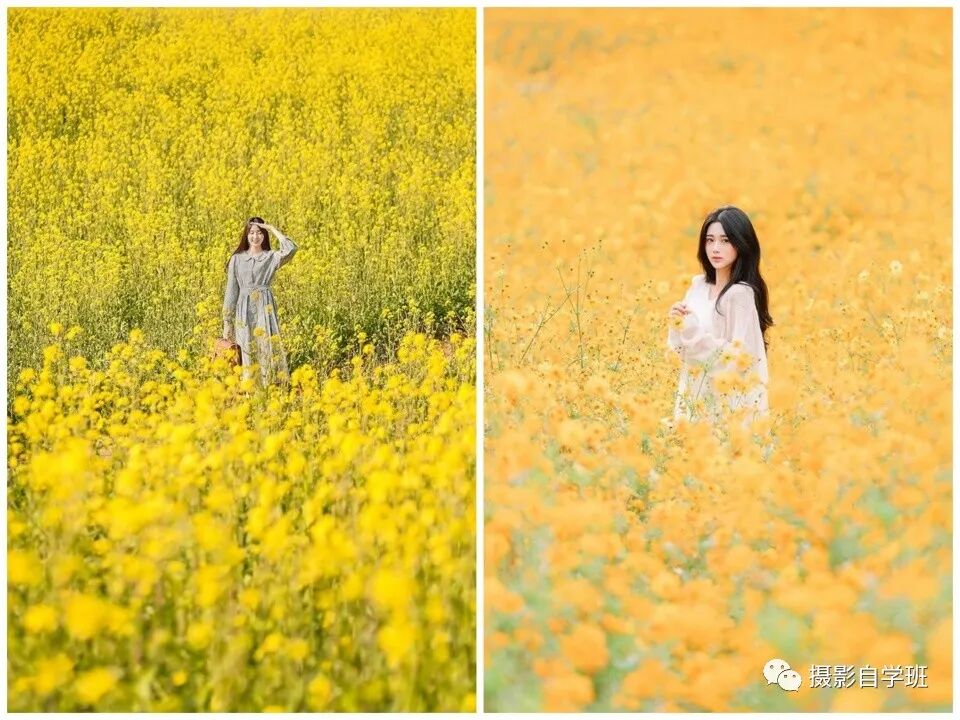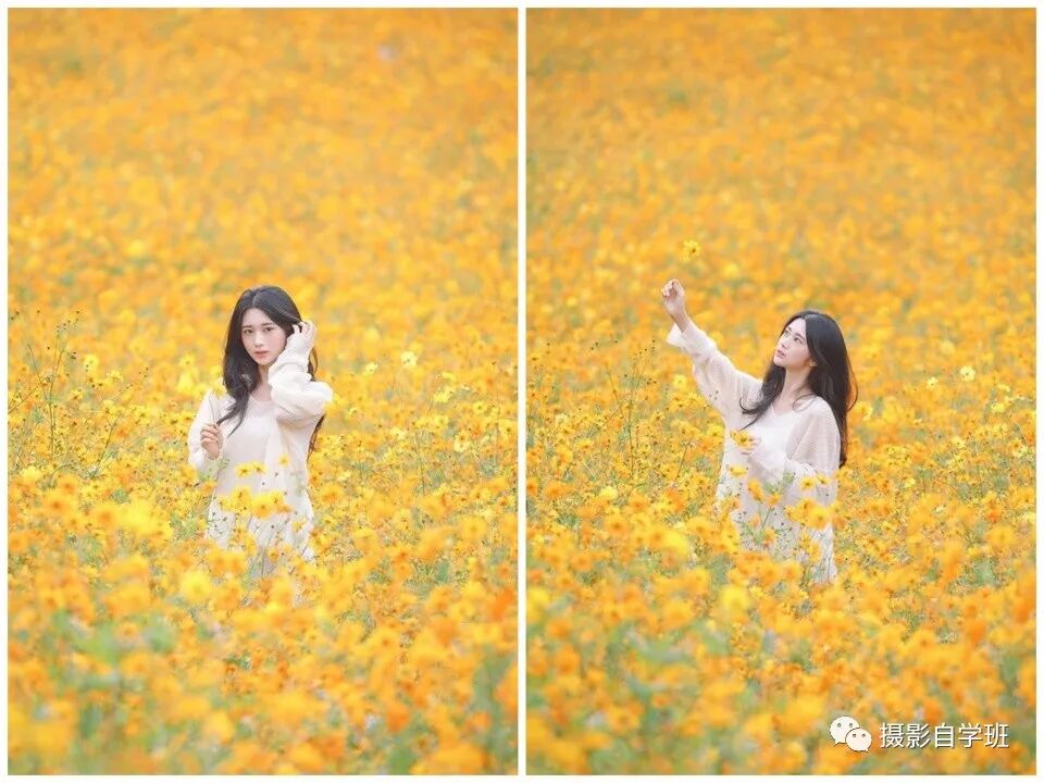 如果镜头距离人比较远,可以让人把手举到额头上,做出远眺的姿势,如果镜头距离人比较近,可以让人两个手捏住花看向镜头。上图左侧,能够看到画面当中的地面略显,这是瑕疵,而右侧镜头低,就可以让花挡住地面。除了摆姿以外,也可以适当把镜头压低左侧,让照片整体的背景显得更干净。