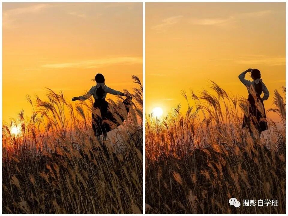 逆光拍摄剪影重点是,测光点选择在相对较亮的地方,人就变成剪影,对焦点,选择在人上。拍摄人的剪影时,一定要注意让人的肢体打开,不要把手臂紧贴在身体上,上图两张照片都是正确的,打开之后剪影有空隙,才会有影,有亮,更透光更好看。如果手和脚都搭在一起,只是一个黑影,姿势就不优美了。