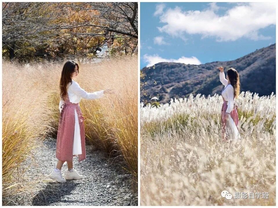 像上图这种高高的草丛,拍摄时左侧的照片是不可取的。地面灰突突的,人物头顶上方的枝条又太多,照片整体都会显得乱,而拍摄的时候,可以找到上图右侧这么高的草,摄影师蹲到草中草挡住地面,同时避开上方杂乱的树枝,用蓝天作为背景照片,就会干净很多,姿势很简单,可以用手扶草或者看向远方,都很漂亮。