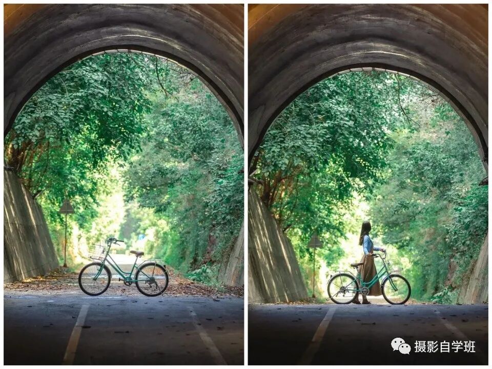 在这种荒废的桥洞摆姿势,可以搭配上自行车,人扶着自行车看向镜头,或者看向远方都可以。摆姿以外的重点是,人要站到光亮处,而不是站到阴影里,这样才能够让照片当中的人更被凸显。