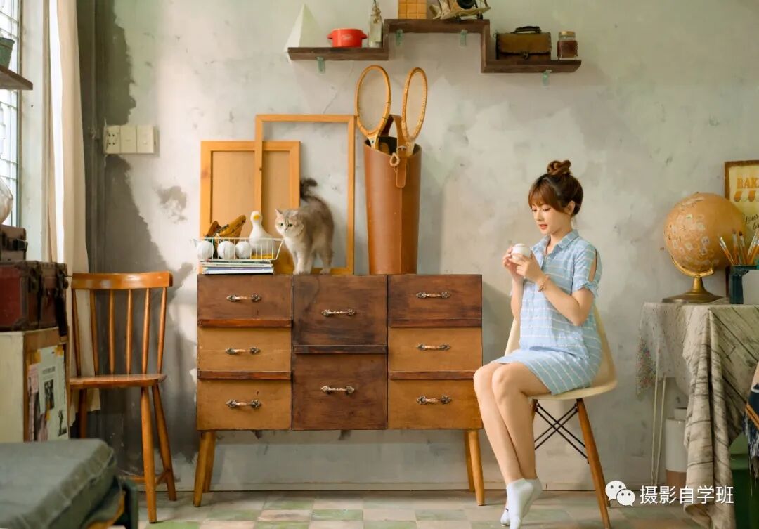 上面与下面这张照片,整体背景,都是棕色、黄色同一色系,上方有一个红色小杯子,作为点缀,这样人物穿一个蓝色的衣服,在画面中,看起来就会格外显眼突出。背景颜色统一,人物颜色突出,主次对比就明显了。你在家中拍摄的时候,颜色上,也可以采用这种思路搭配。