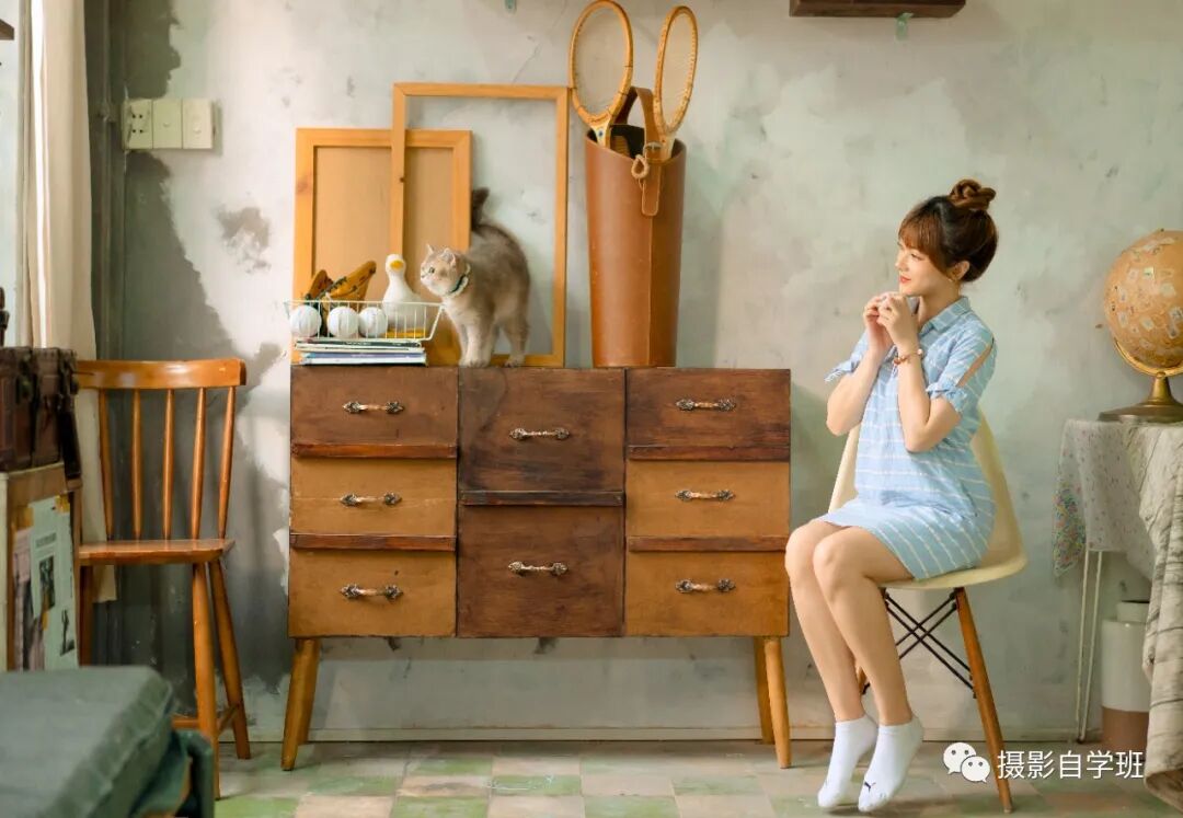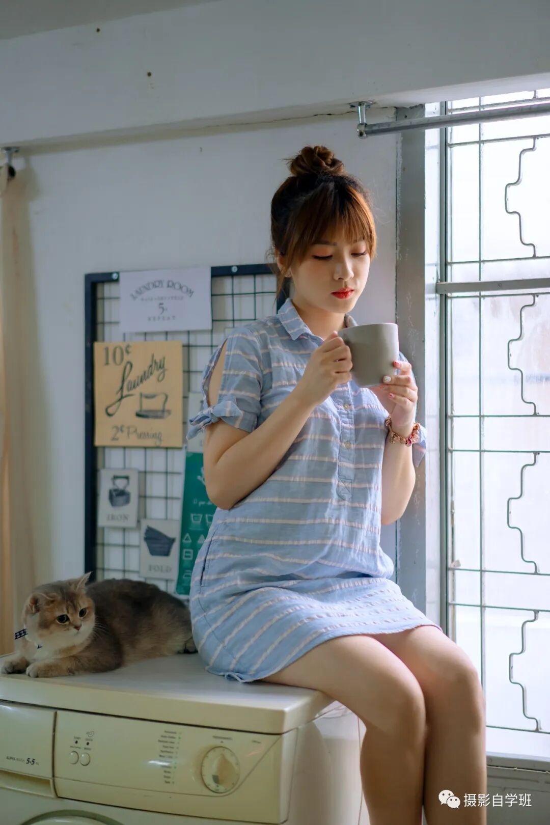 利用家中的小猫咪小狗和其他小宠物,就可以增加照片的趣味了。如果猫咪正在看镜头,可以像上图一样,对焦放在猫咪的眼睛上,把人物拍虚化。如果猫咪看向窗外,那就要对焦在人的眼睛上,把猫咪拍虚化。