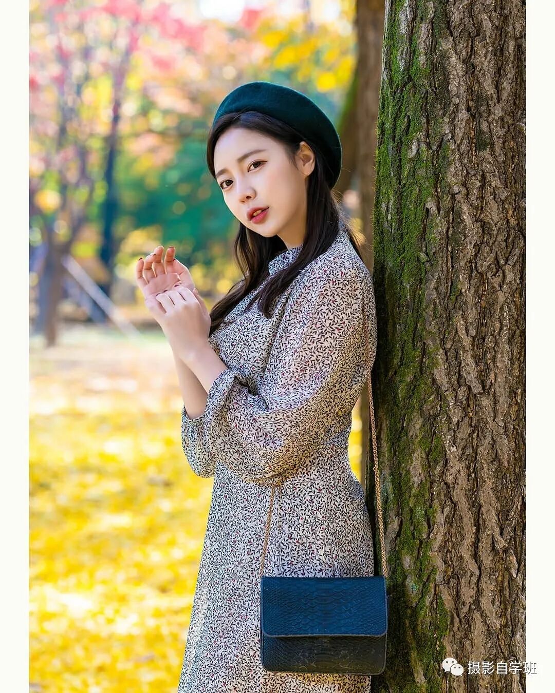 上面这张照片,人的妆容衣着环境都很不错,但是背景中,粗壮的大树,让画面显得很乱了,因为树干粗壮,颜色很深,在画面中的占比,比较重,这就会分散观者观看主体的注意力。所以不要像上图这样,让大树作为背景,而是可以站在大树附近,依靠在大树上,让它作为身边的陪体。而且粗壮笔直的大树,在人身后,也会让人显得更加挺拔。模仿下图的姿势,你也可以拍摄得很优美。