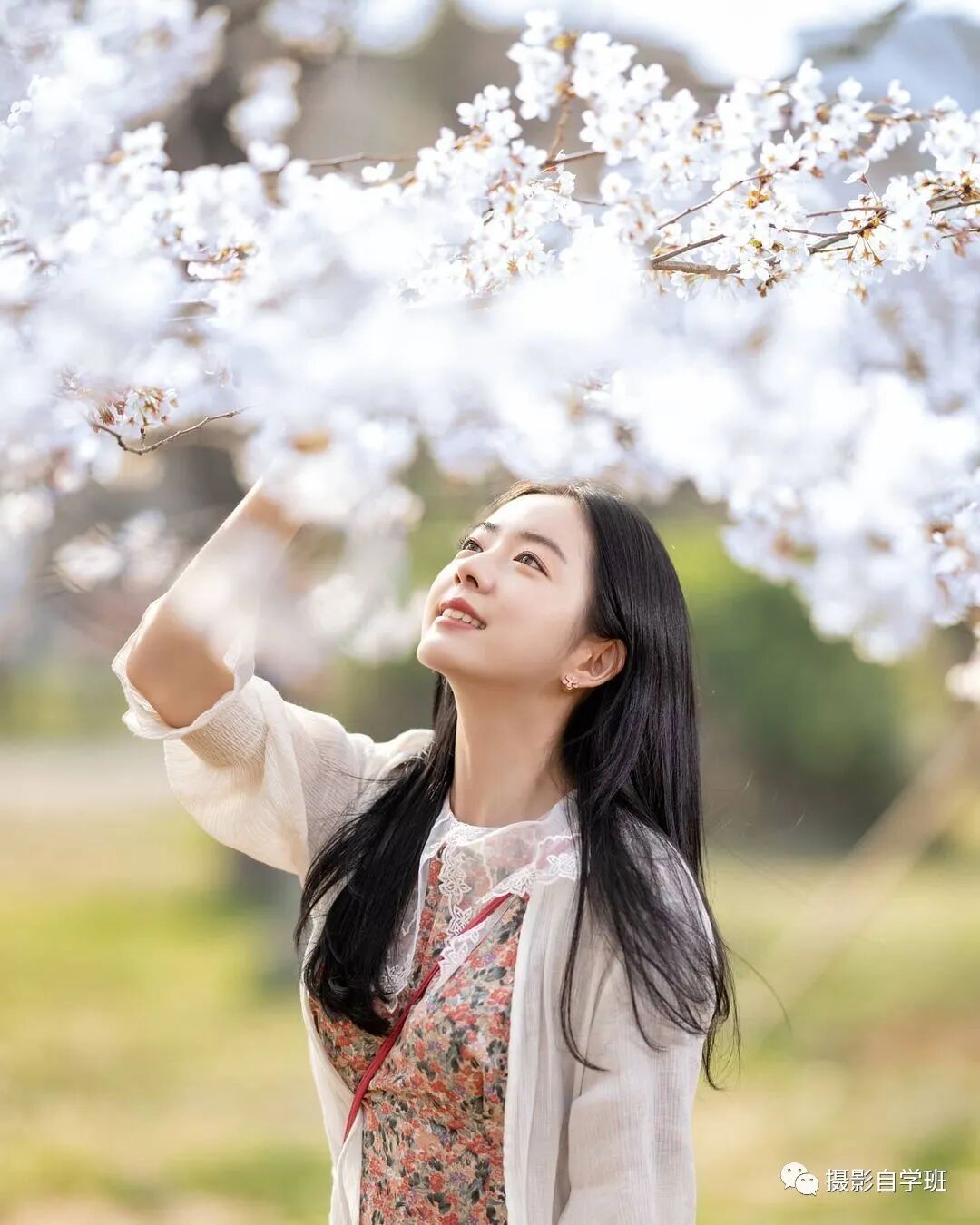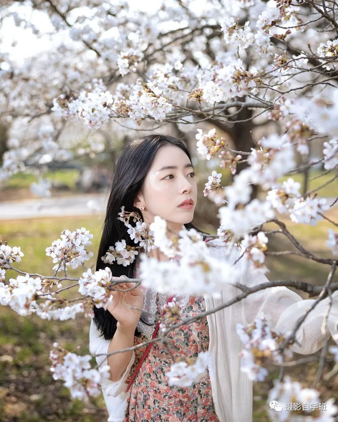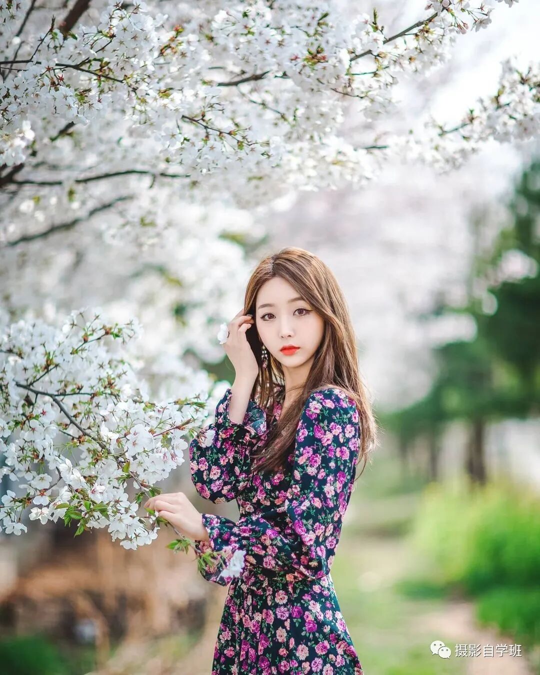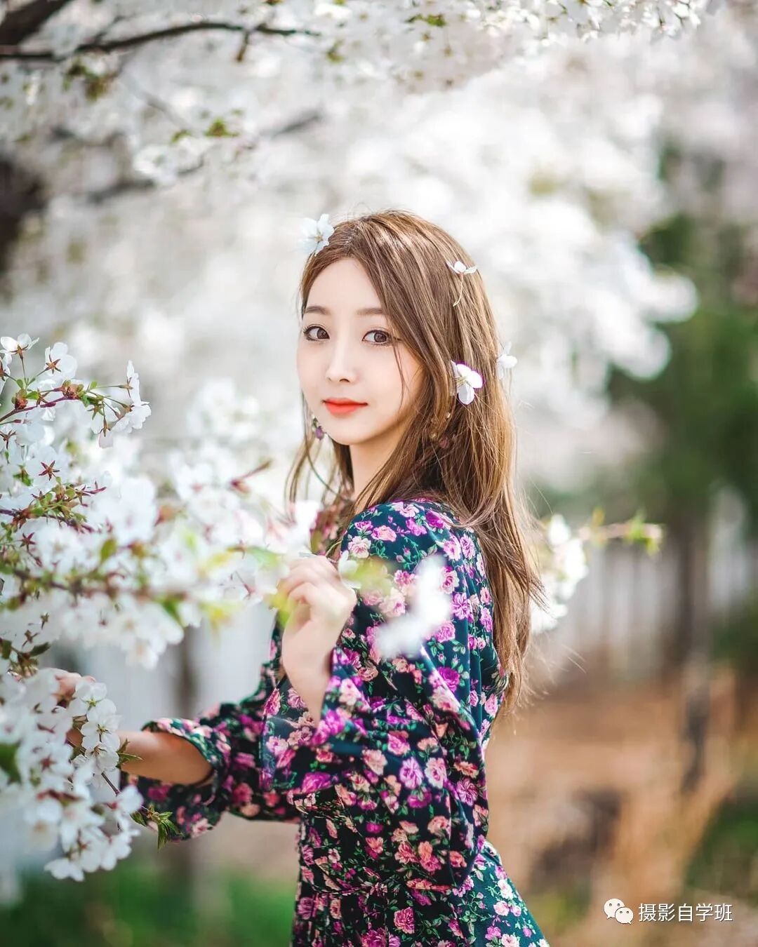 让被拍摄的人,手中拽过来一些现场的物件,比如下图的花枝,挡在镜头前面,形成虚化,这样也能形成空间感。