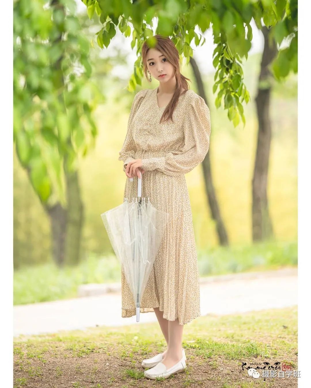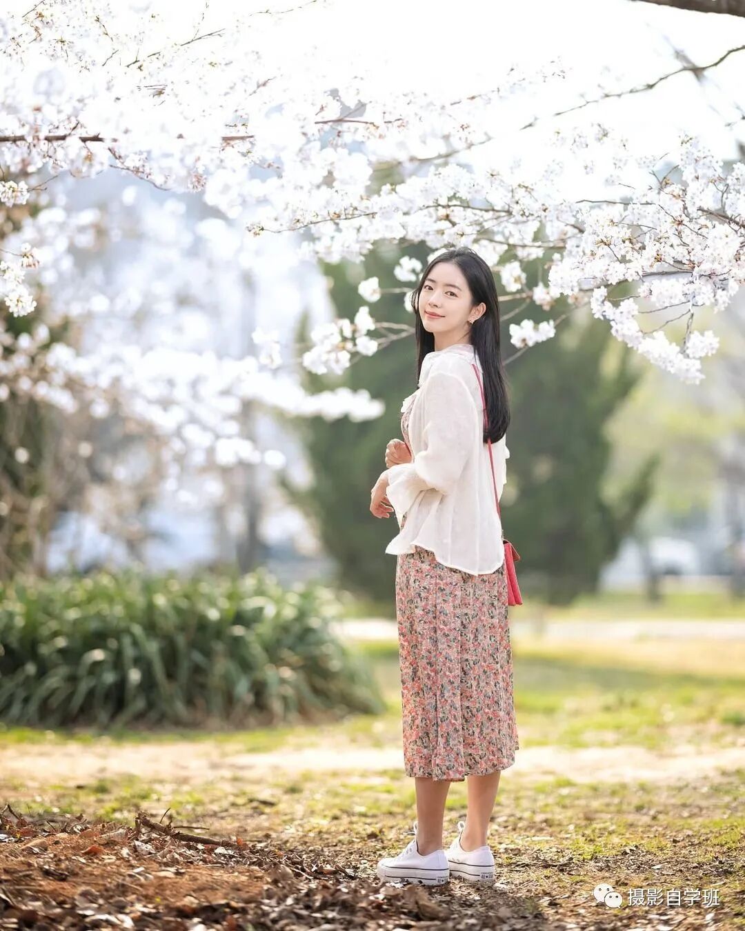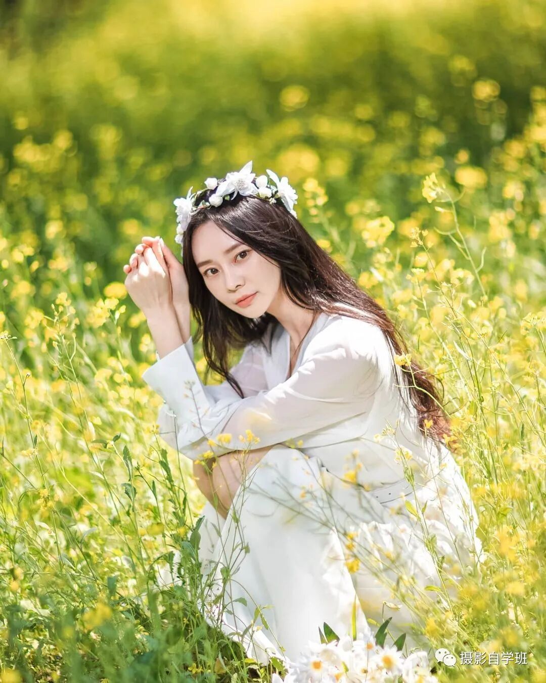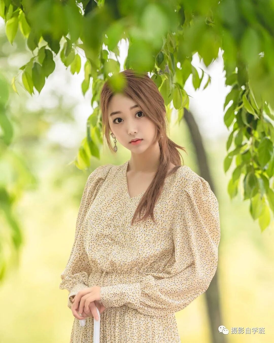 用现场的景物,遮挡一下,就可以完美解决了。人手中再拿着一些花,姿势不僵硬,还很优雅。
