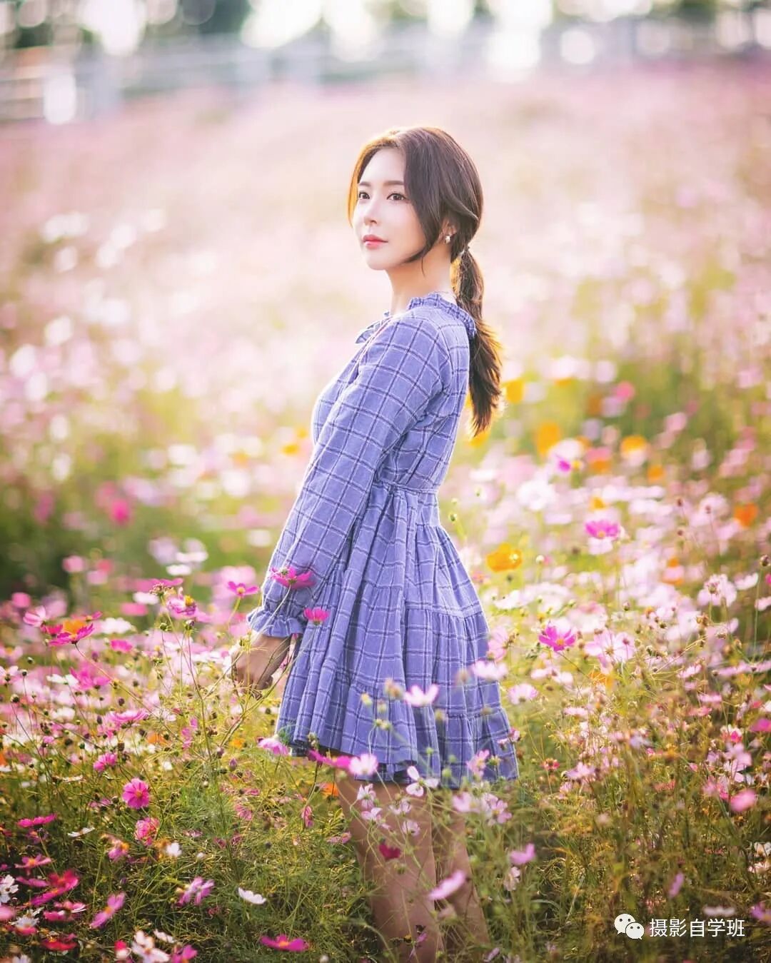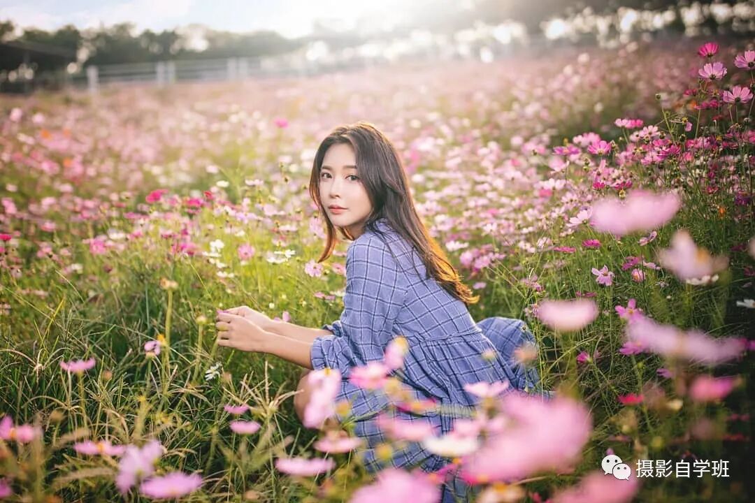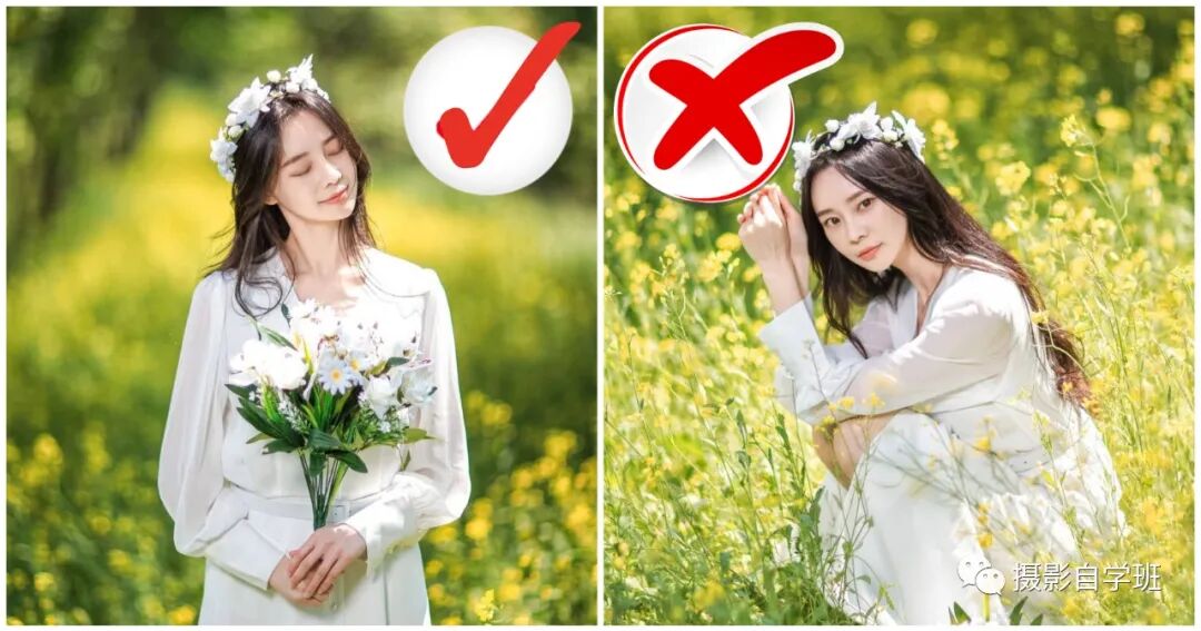 上面这种姿势,看起来,多多少少,有点不那么优雅。这么好看的一大片花海,完全不用蹲在地上。而像下图这样,站在花丛中,手中拿着小花,姿势不僵硬,还很优雅。但下图也有些小瑕疵,你看出来在哪了吗?