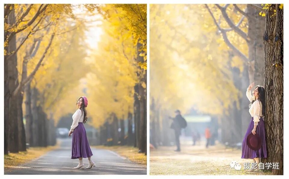 利用林荫路拍出纵深感,人物可以在路的中间,可以在画面的一侧,随意在画面的什么位置,都会拍出很好看的照片。但要注意的是人群,好的地方往往会出现扎堆现象,我们需要大光圈的镜头,来虚化背景,也就是虚化人群。
