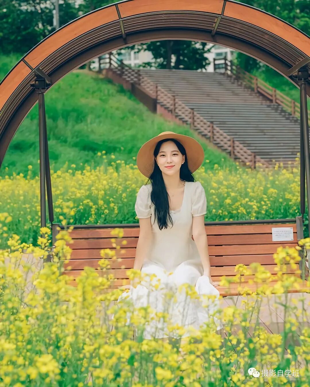 如果在花海当中,拍摄照片,一定要结合现场环境,像上面这张照片,人抬头看向左上角,但是左上角,并没有相应的景物,而我们能够看到背景当中。有一个建筑,那就可以调整拍摄方向,让被拍摄的人,往有景物的地方看,摆姿就不会过于尴尬。而如果有其他景物,像下图这样的凳子,直接让被拍摄的,人坐在花海当中的凳子上,拍摄一张,就会丰富你整组照片了。