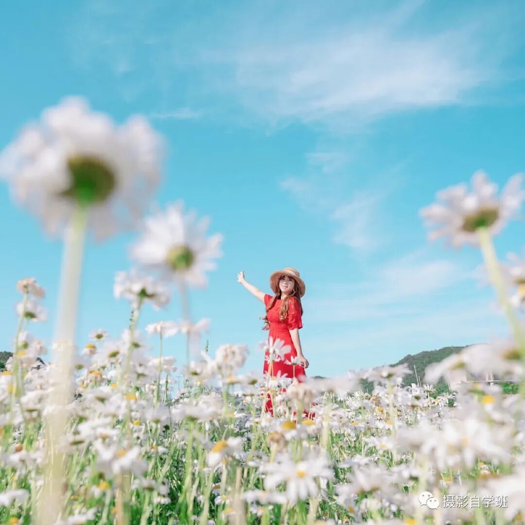 如果你去花海拍照时,现场有很多人,那一定要试试这个摄影技巧,把相机或手机,放到接近于地面的花海当中,这样地面的花,就能够挡住周边的行人了,拍出上图与下图这样的仰角大片儿,画面没有其他人捣乱的同时,被拍摄的人,还能显得非常伟岸。