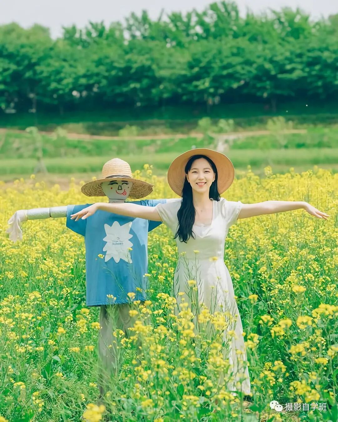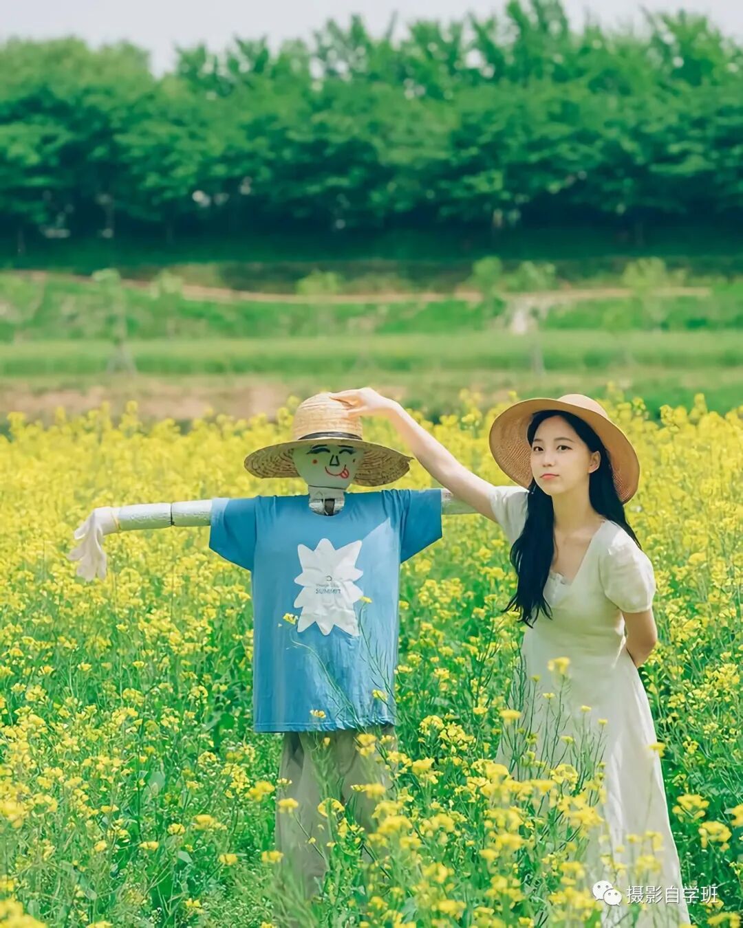 在花海当中,如果拍了很多照片之后,没有姿势可摆时,一定不要忘了,寻找花海当中的稻草人。我们可以现场模仿稻草人的动作,像上图一样,或者现场与稻草人互动,像下图这样。只要画面当中,出现了道具,或者其他能够互动的陪体,拍摄的姿势,就能够更加丰富。