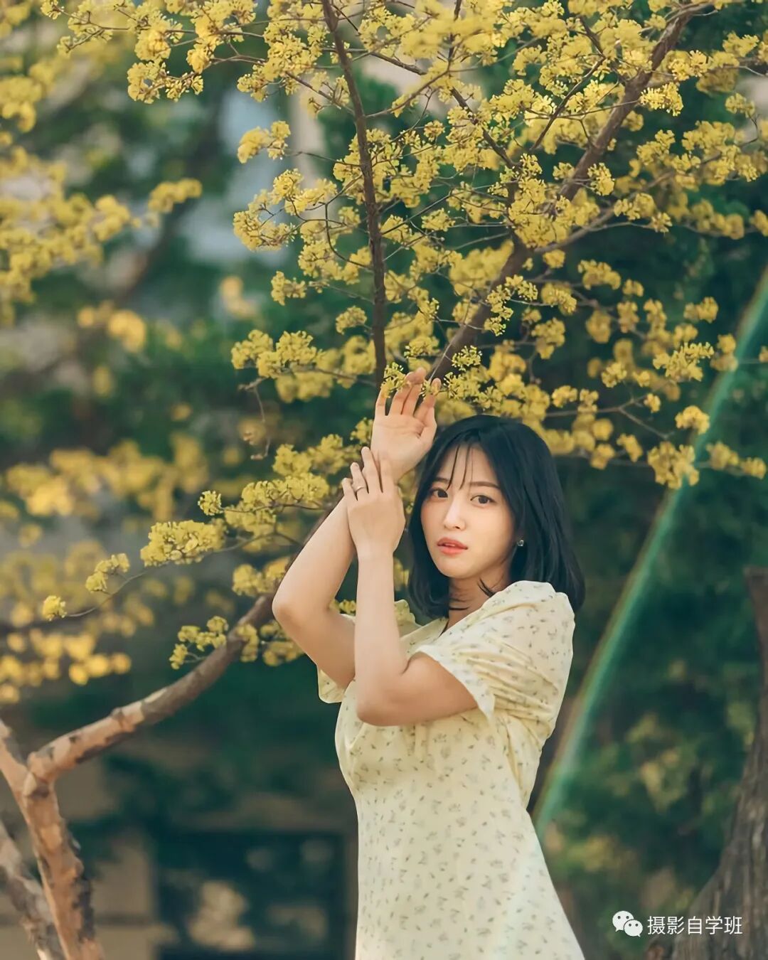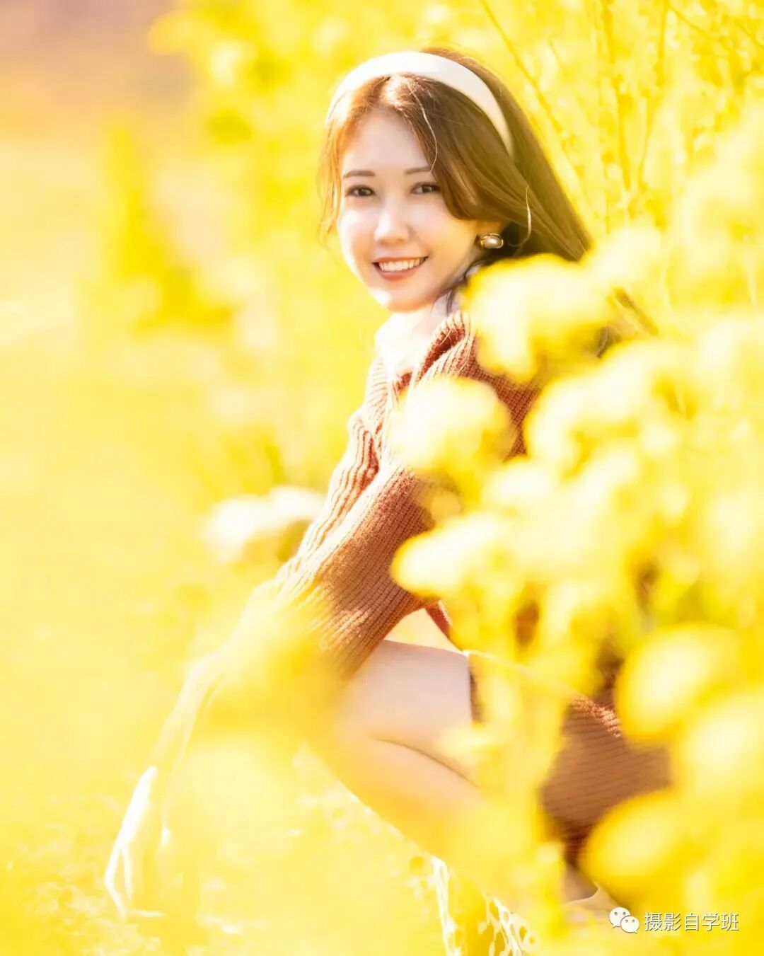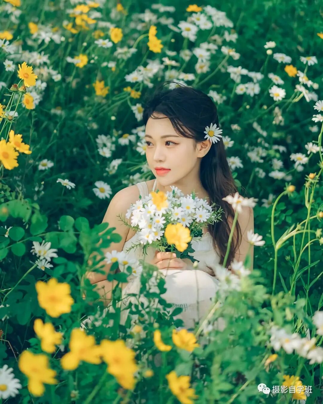后期调色可以,不要把饱和度加得太多。前期拍摄,也要注意,不要让周边环境过于艳丽,如果艳丽,人在这样的环境中,不容易被突出。而像下图这样,整体背景是绿色,鲜艳的黄色作为点缀,会更好看。花丛中摆姿,注意眼神就可以了,可以像上图这样,看向镜头,也可以像下图这样,看向远处。
