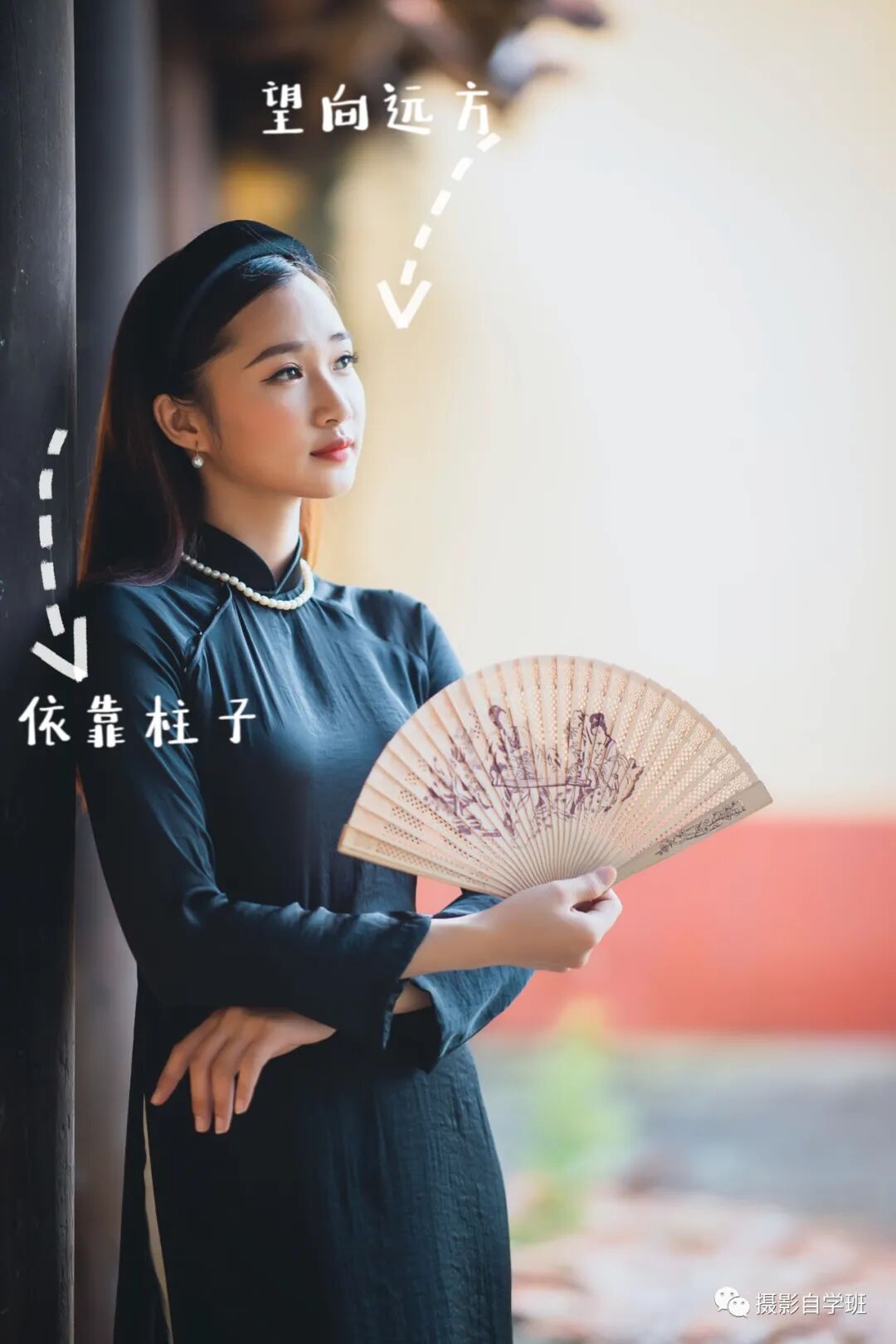 靠门靠树,有能依靠的地方,要学会依靠,因为这样会使人放松下来,人放松了之后,就会自然。像上图,靠着门,扇着扇子,很惬意放松,优雅地望着前方,大方得体。我们拍摄的时候,如果拍摄拘谨肢体就会变得僵硬,表情不自然。