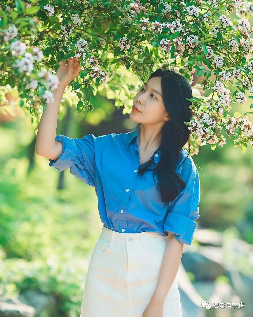 看树叶,看花朵,不管看什么,都会帮助人物缓解尴尬,这样的拍摄姿势,我们也可以说是借助道具的一种,让手有地方放,让眼神不空洞,画面意境,达到我们知性美的效果。因为年龄的原因,我们尽可能地不要卖萌,比耶,又蹦又跳,这样会不美观,也和我们的气质不符合。