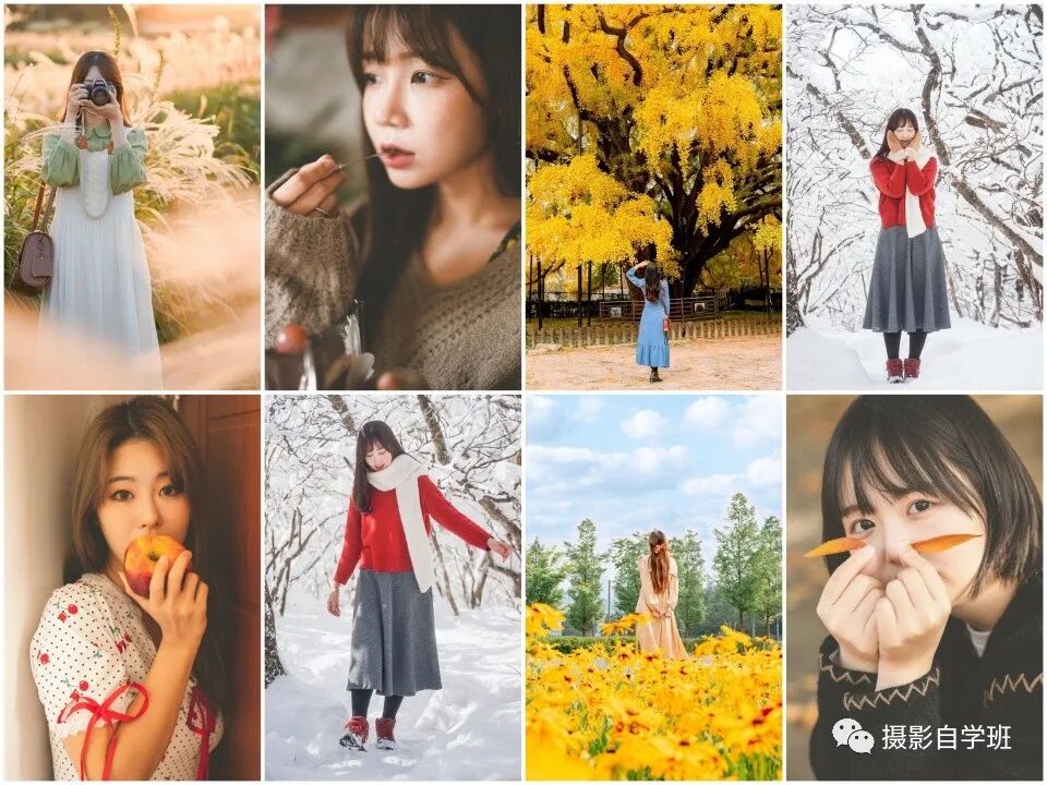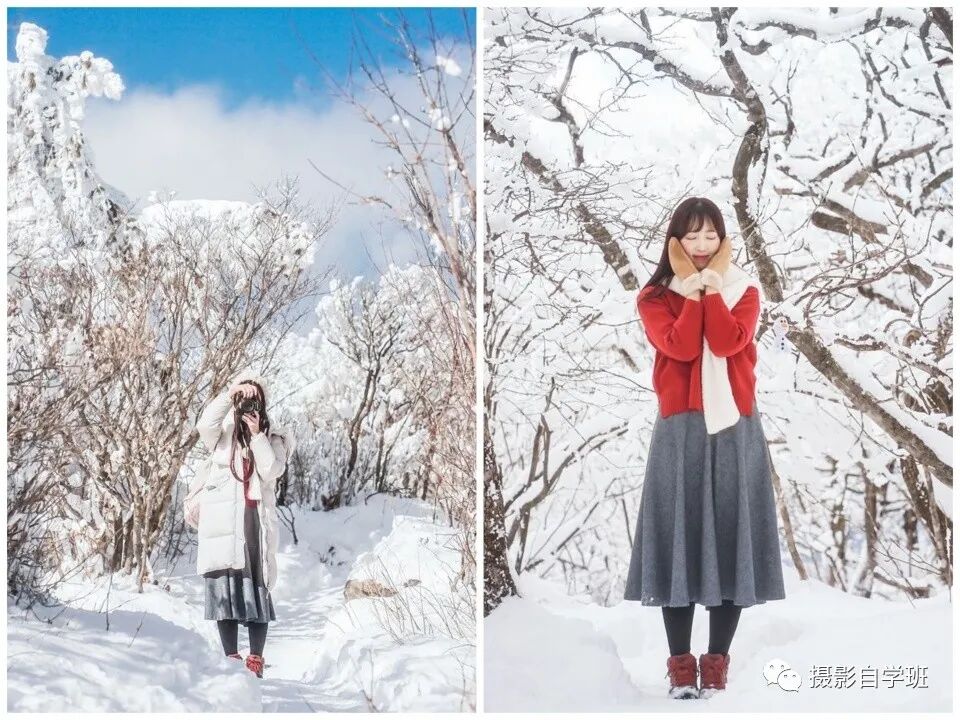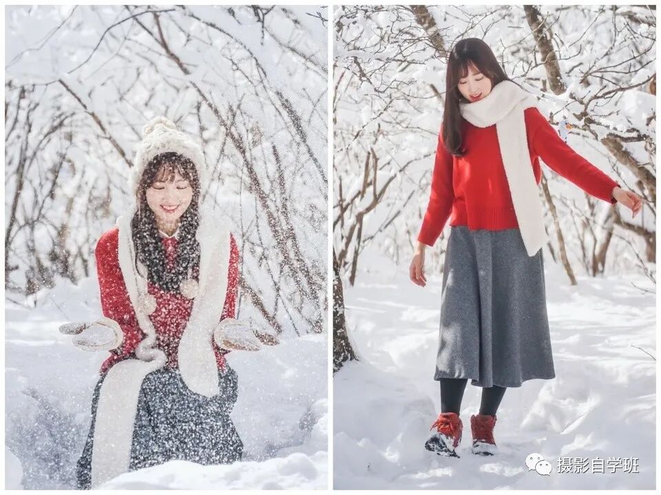 冬天拍摄雪景,一定注意,不要像上图左侧这张这样,穿着白色的衣服。因为冬天雪已经是白色的了,人再穿白色的衣服,和背景区别不大,甚至无法区分,人像照片中的人像主体,就容易不突出。而像上图右侧这样,穿一件红衣服,雪白的背景,照片就有亮点,有对比,主体人物更突出,两个手托住下巴的姿势就很美。