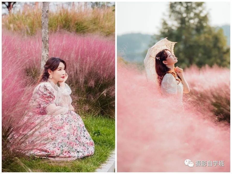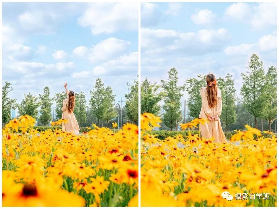 在花丛中的姿势,与草丛中类似,但是,不要像上图左侧这样。人被花挡住的部分比较少,地面景物,还带上了路边的条石,画面看起来就会很乱。而应该像上图右侧这样,再往花丛中走一走,让花丛遮挡人,遮挡得多一些,整个画面看起来更柔和。
