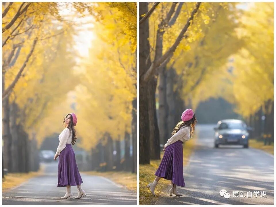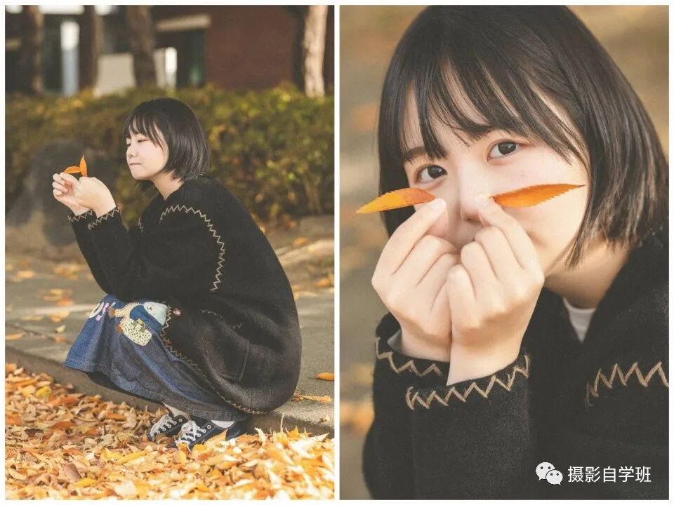 在有落叶的季节,人在路边环境杂乱,不要像上图这样,拍人蹲在路旁,整个场景也不美了。但是,环境不美的时候,可以怎么办呢?可以像上图右侧这样,拿着两个叶片,挡住眼睛,摄影师注意,要近距离拍摄,这样人的占比就大了,杂乱背景占比就小了,照片美观度就上来了。
