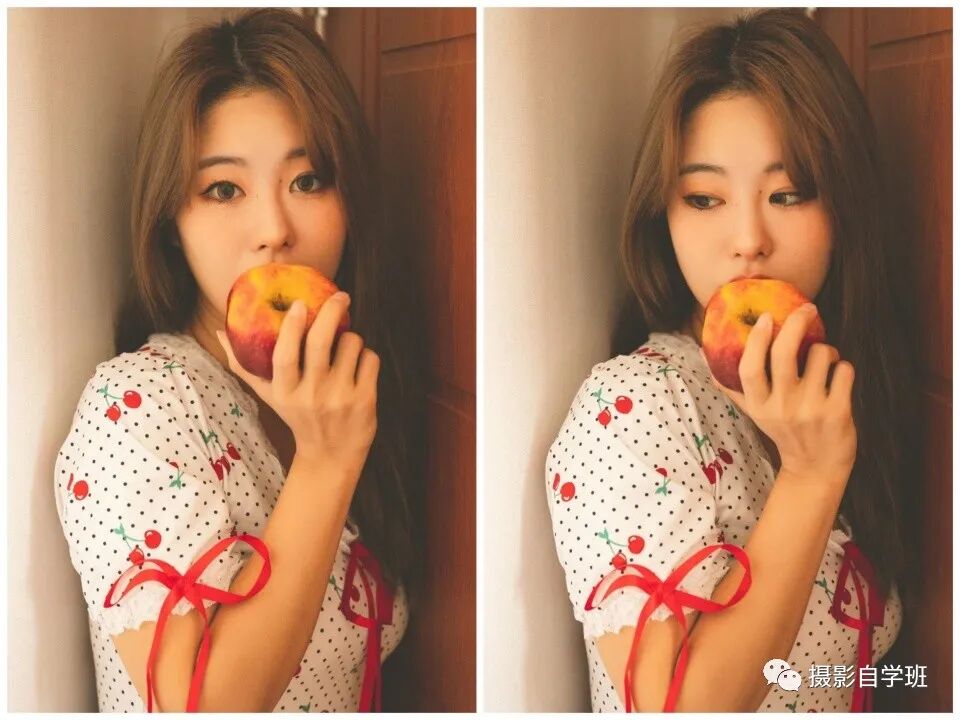 在家拍摄,最简单了,可以像上图这样,找个苹果,找个夹角,看镜头或者看地面,姿势就很美了。但这里的重点是,人的脸面向窗户,因为窗户有亮,可以给人的面部补光。