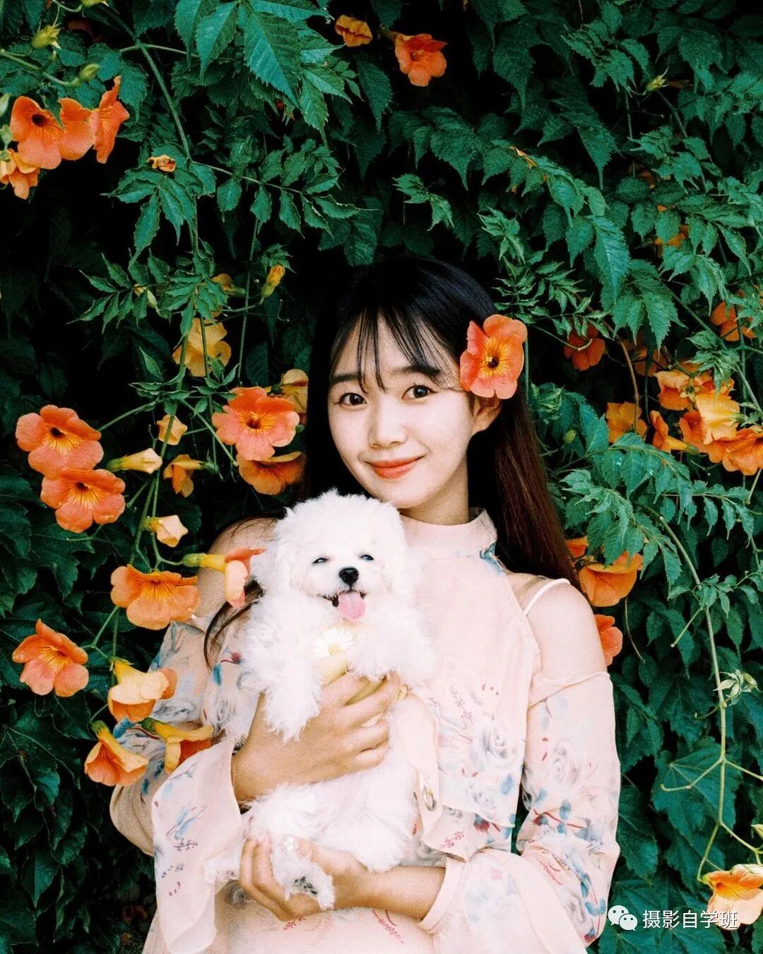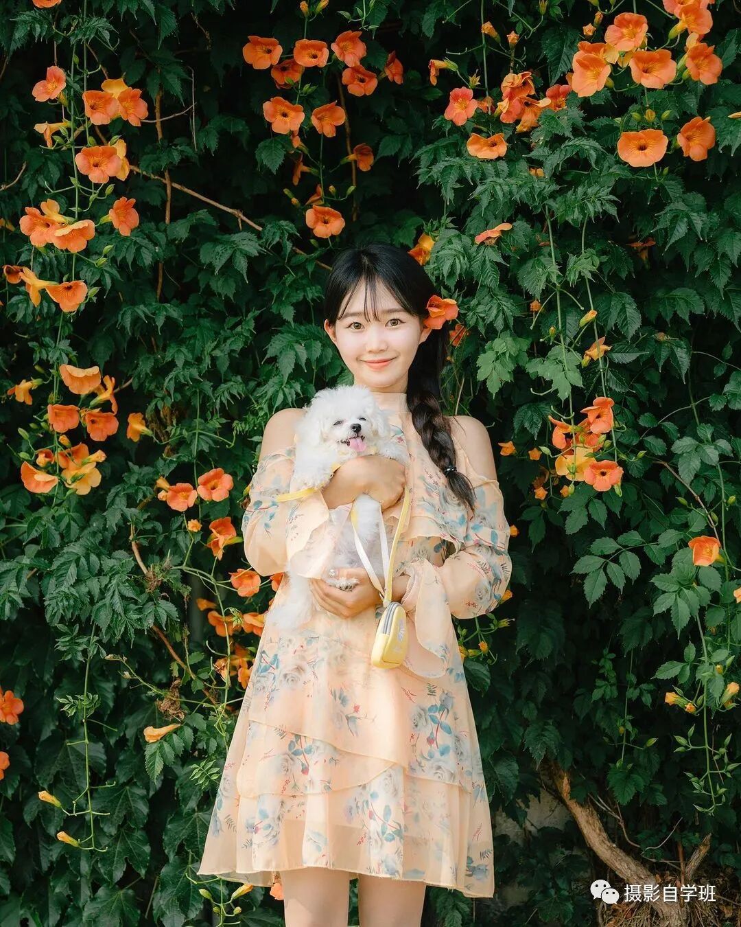 如果你的体型,比较富态的话,那可以模仿上图与下图,这样用拍摄现场的一些植物,遮挡住身体,就能挡住你的富态了。但是上图有一些小瑕疵,遮挡身体的同时,一定要遮挡住,背景中不好看的部分,上图背景,地面不够漂亮,所以应该把左下角的部分,也挡住。像下图这样,现场路面不好看,干脆用花完全遮挡住,同时也能挡住人物的腰部,使被拍摄的人,更显苗条。
