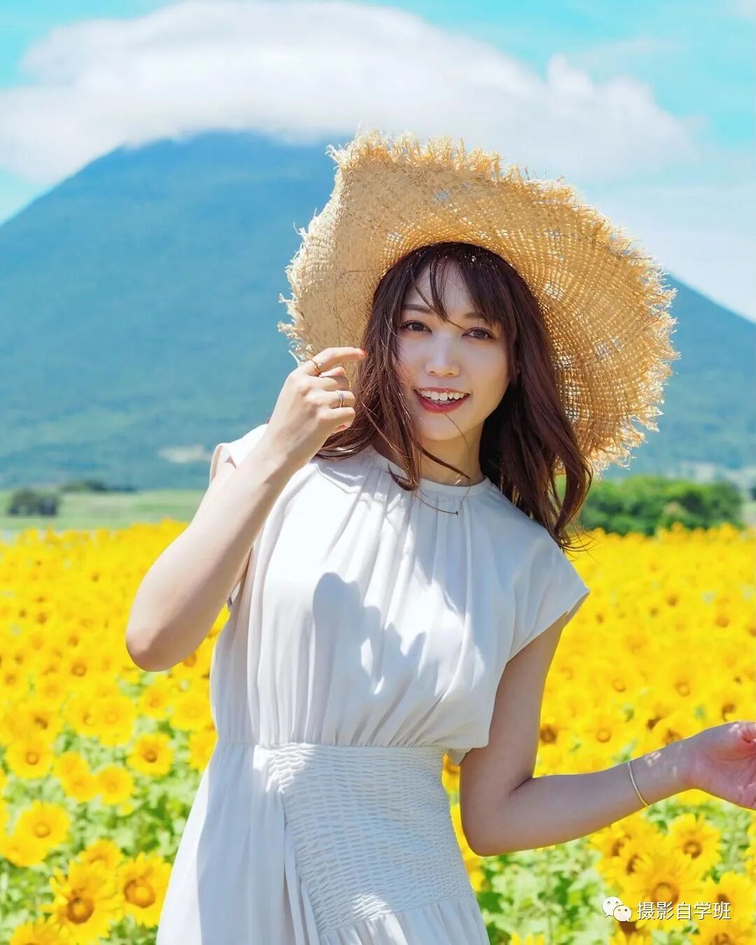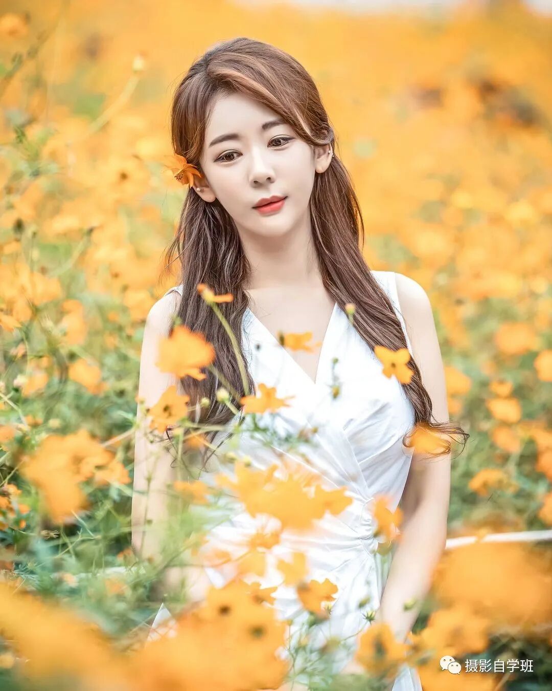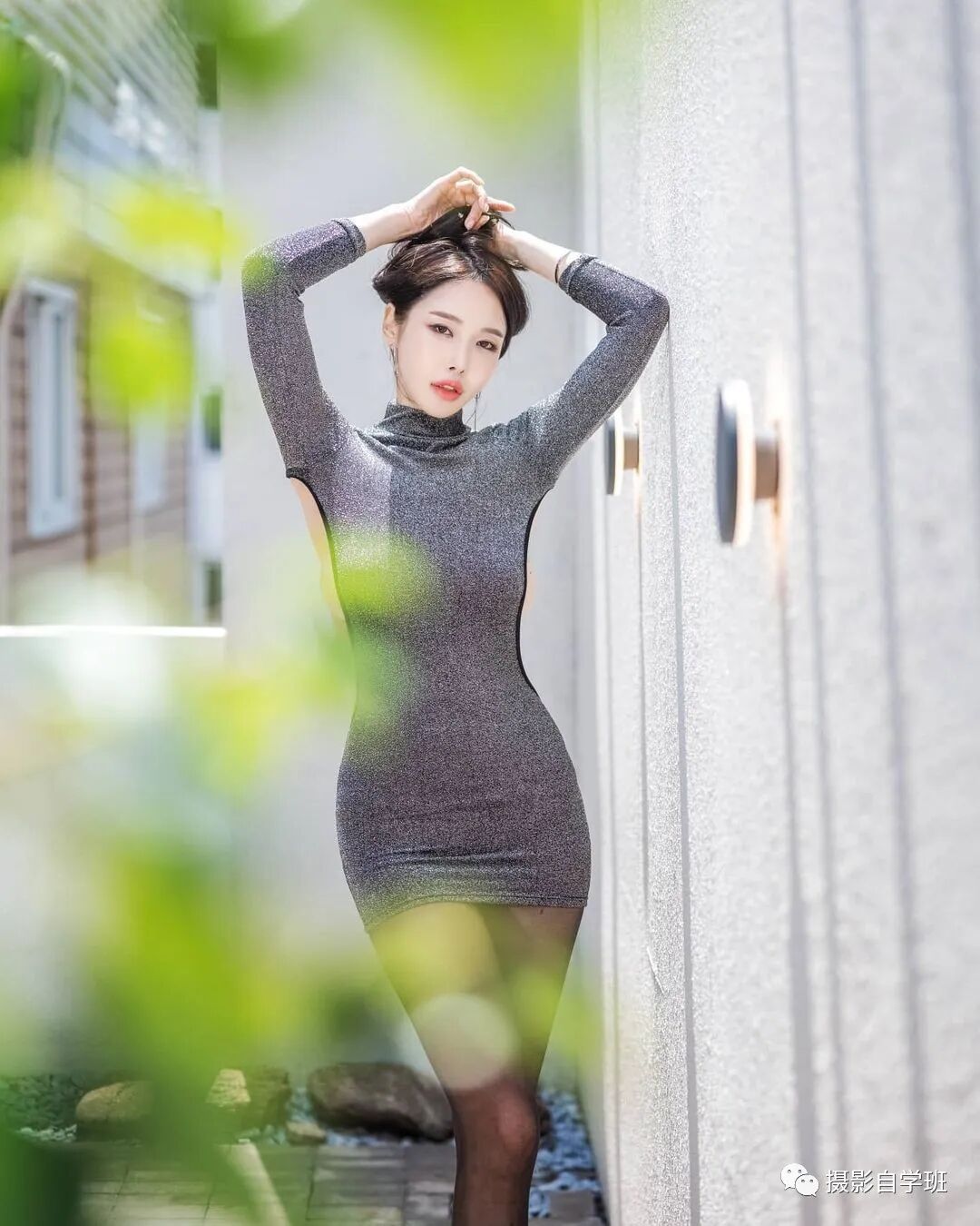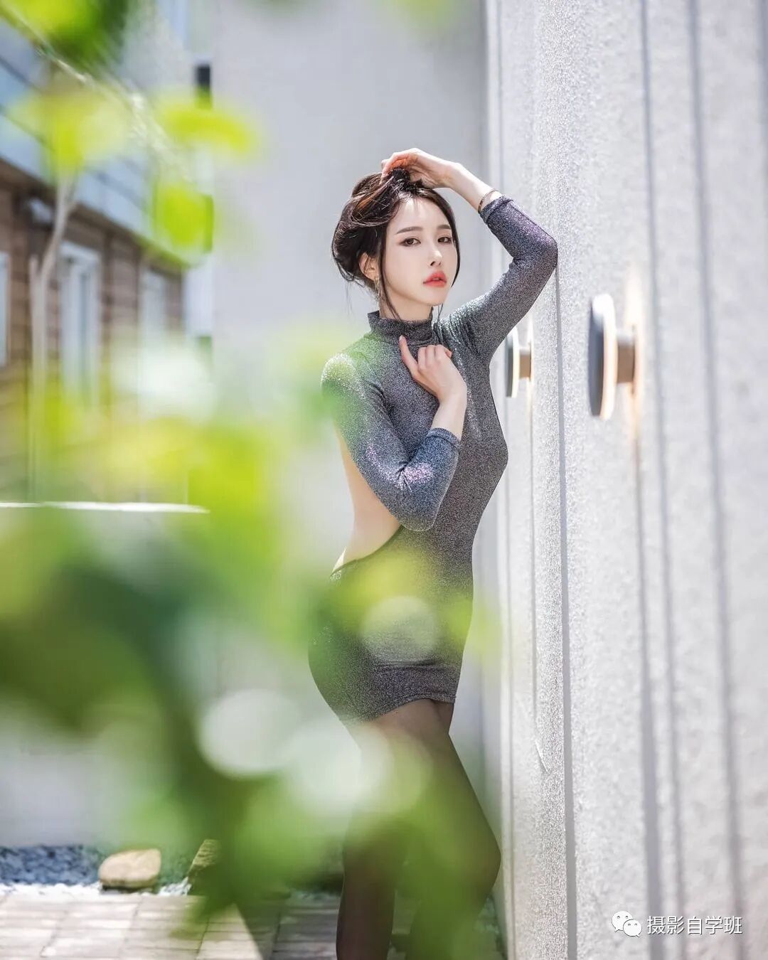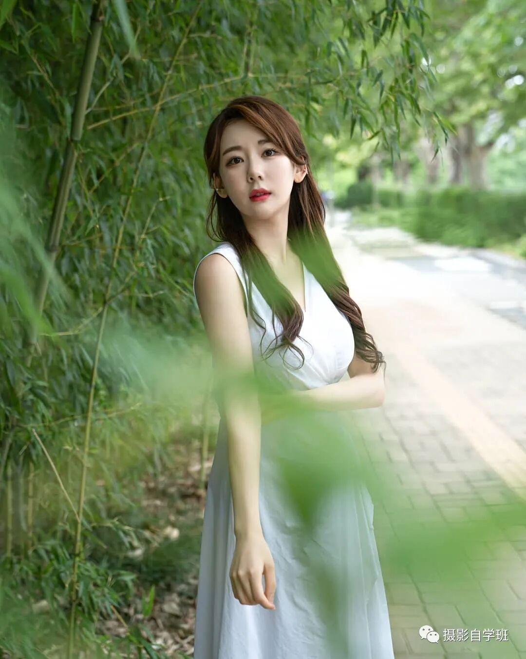 如果一人的身形比较优美,那在摆姿的时候,一定要注意突出自己的优点。手不要贴着身体放置,像上图这样,打开一些,形成弧线,更能体现曲线美,腿也不要直直地站立,像上图这样弯曲一点,更好。但上图有一个错误,就是前景虚化部分,遮挡得太多,影响了人物的主体。虽然增加了照片的层次,但是看起来,难免也有些乱。我们在用前景遮挡的时候,要注意,避免这种错误。