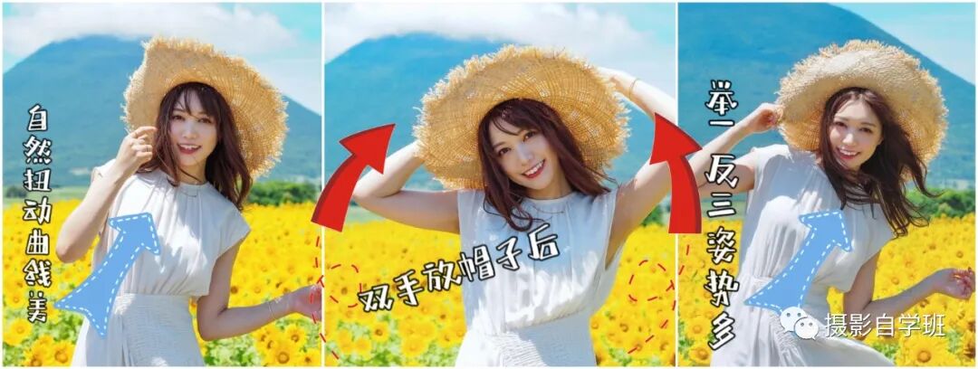 可以让他像上图,把双手全都放在帽子后,同时让他身体,适当弯曲摆出弧线,形态会更加好看,要注意连拍。摄影姿势想自然,除了现场引导以外,还要求摄影师会抓拍,秘诀就是使用连拍,在多张摄影姿势当中,挑选出一张最自然的,就不做作了。手机连拍的方法很简单,就是按住快门不松手。