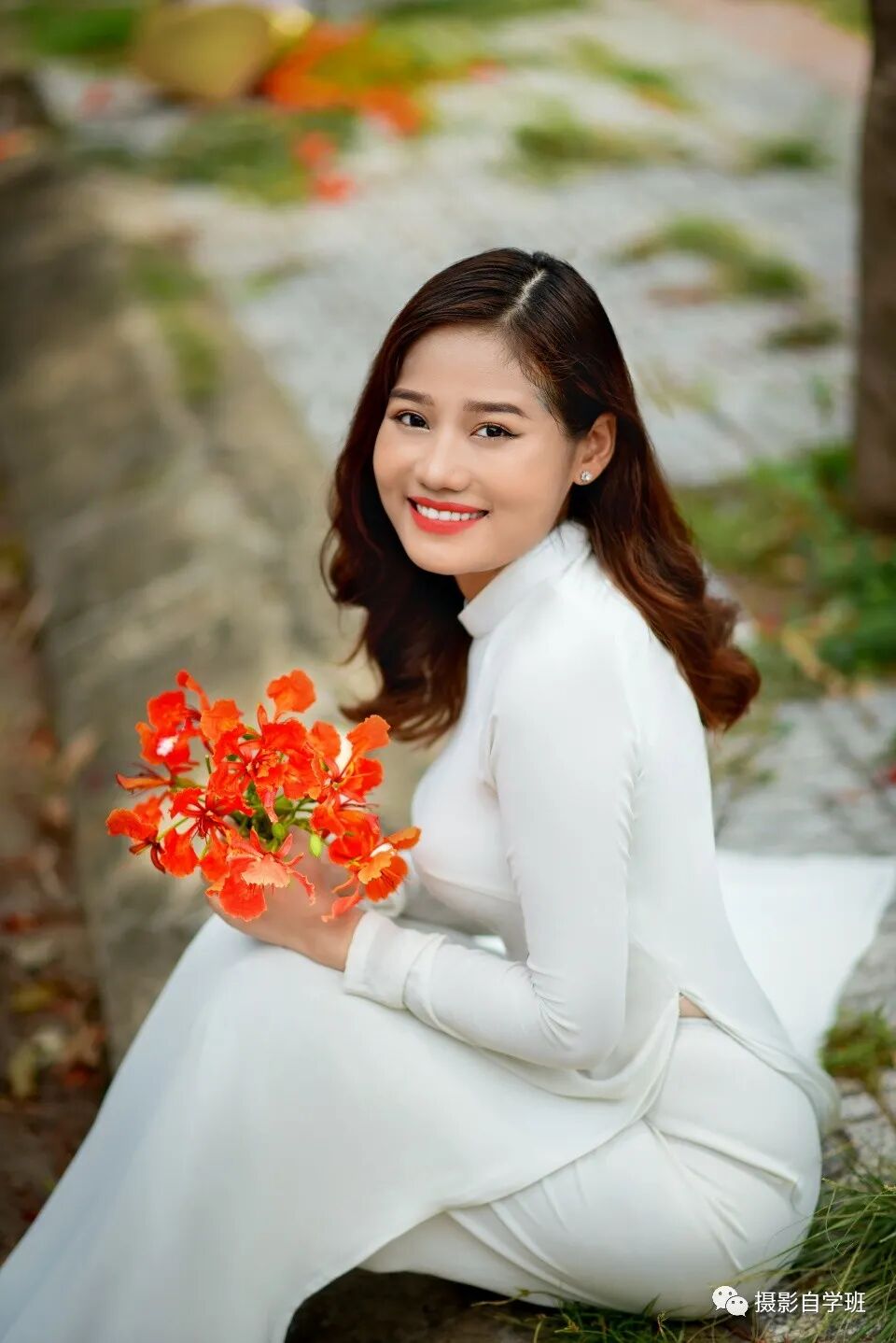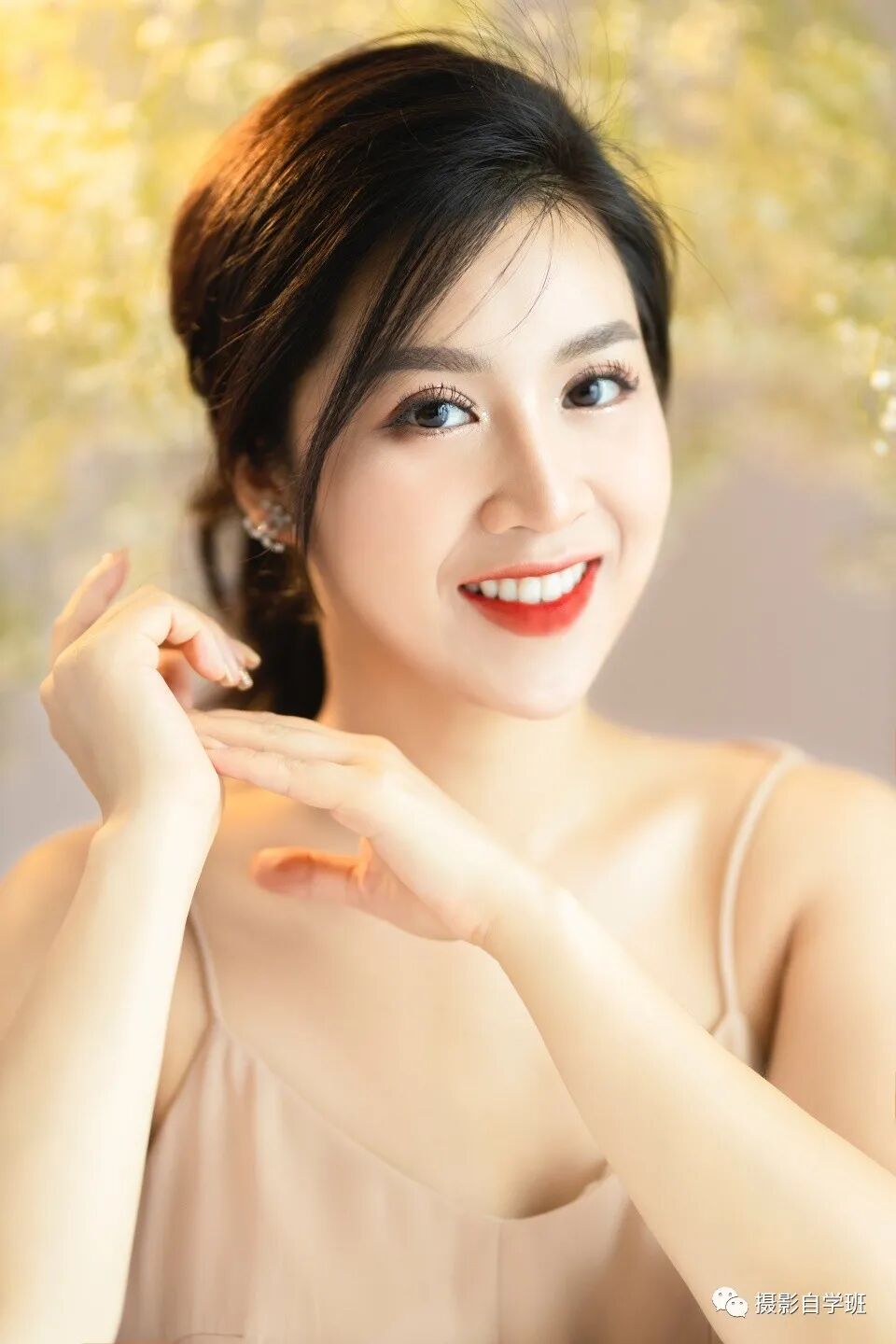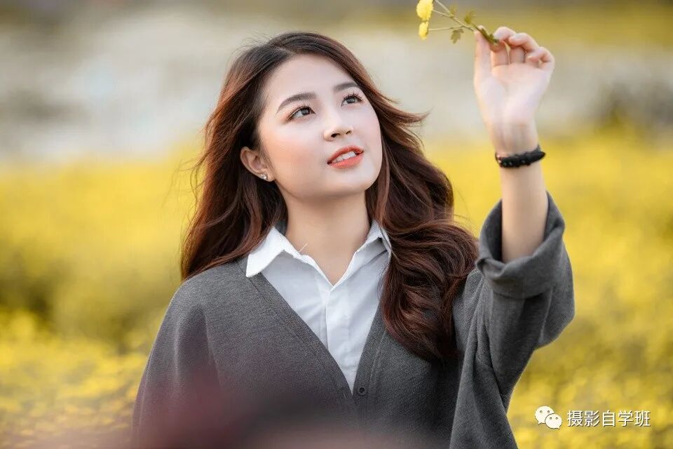 爱自拍的人都知道这个拍摄角度,斜上方45度是最佳拍摄角度,不仅会把人物拍摄的美丽大方,而且这个角度也比较显瘦。所以我们让人物以坐姿的方式呈现,摄影师在她的斜上方45度角的拍摄位置。