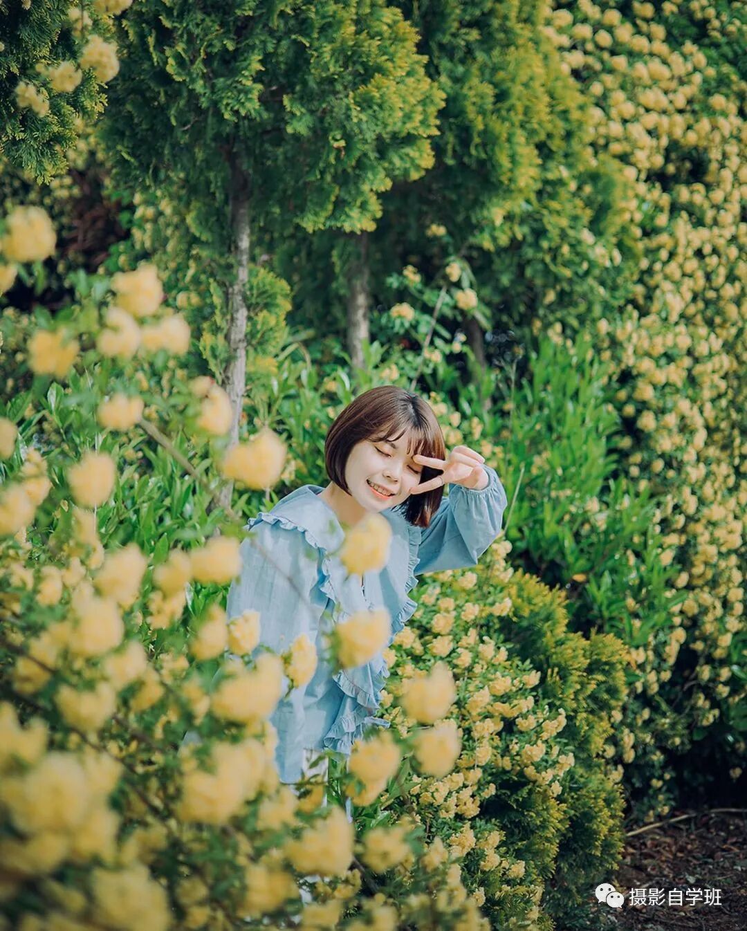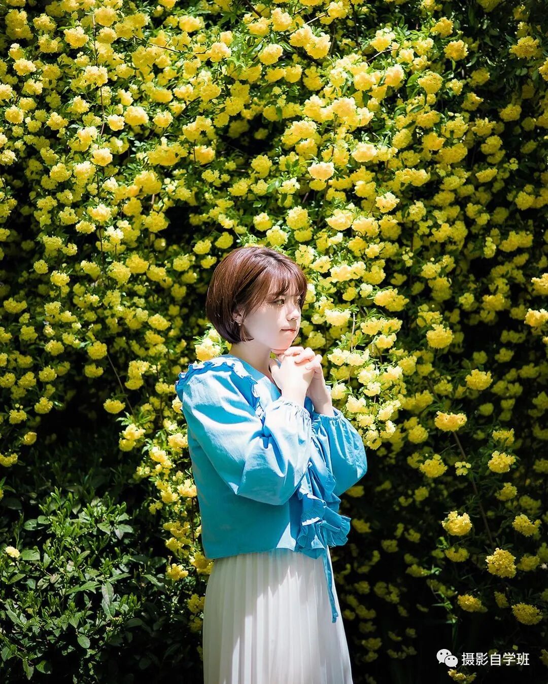 无论春天、夏天、还是秋天,总有盛开的花墙,但有些时候,被拍摄的人,不适合隐藏在花墙中。看上图,这种花墙有明显的枝条,枝条,即使在前景中虚化了,也会让照片看起来有点乱。而这种情况,可以像下图这样,让人站在花墙外,以花墙为背景拍摄,就会更好看一点了。
