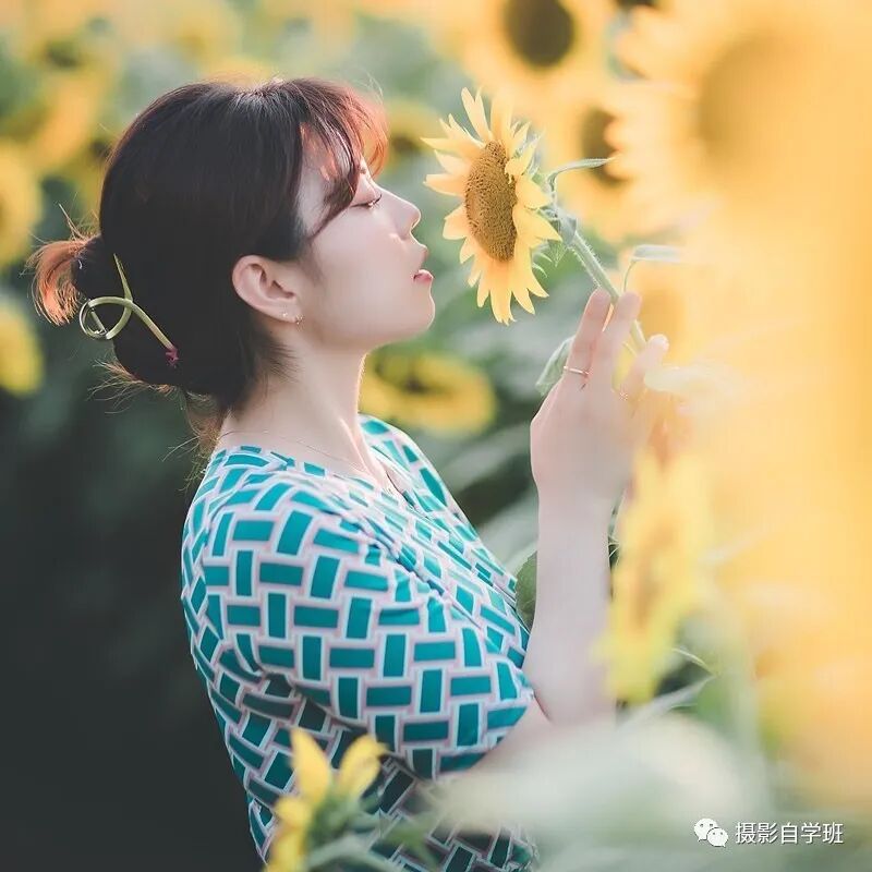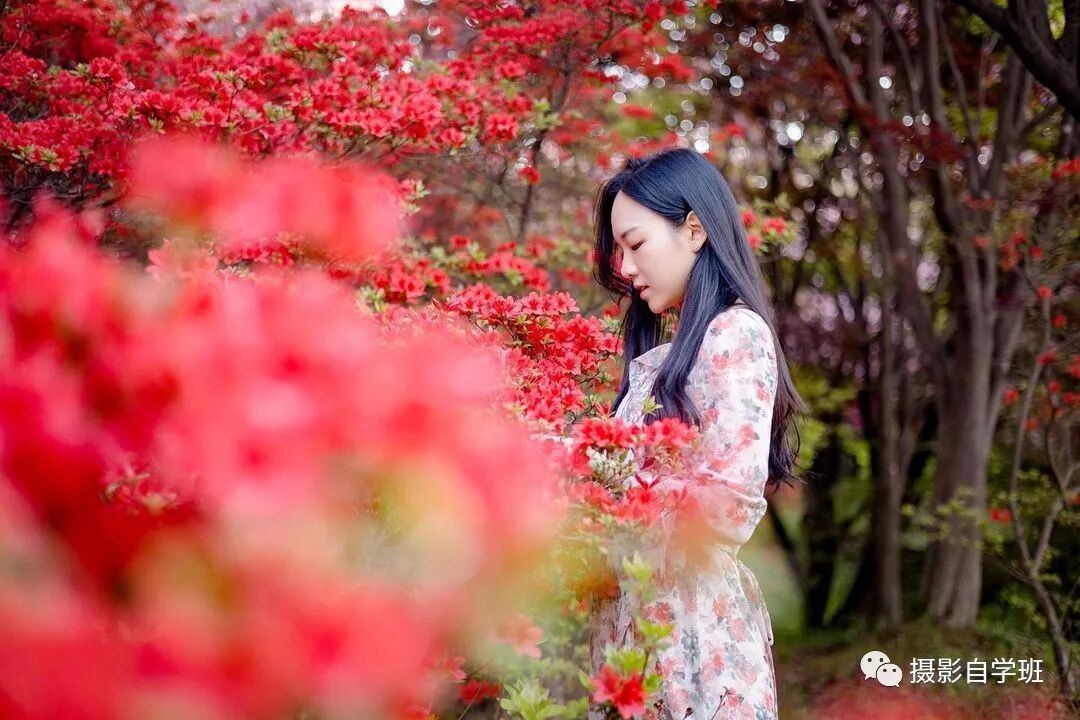 上图左侧前景的花,太厚了,导致照片左侧看起来像不透气一样,陪体占比过重,就容易喧宾夺主。人在画面中,显得不那么重要了。而像下图这样,右侧虚化的花朵,看起来薄薄的,引导观者向后看的视线,起到了很好的陪衬作用,这样,就没什么毛病了。