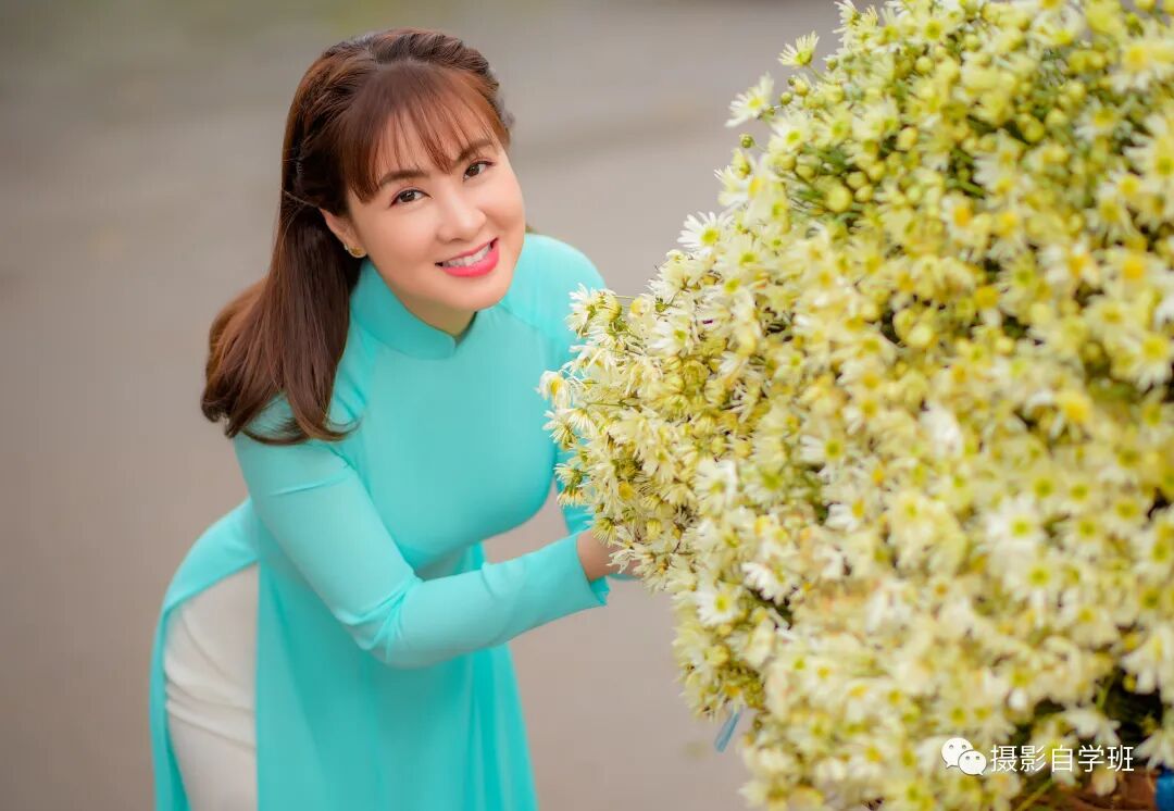 院子的一个角落,小雏菊开得正茂盛,摘下来做一个手捧花束,当作拍摄的小道具,因为如果是人进入到菊花丛中拍摄,多少会有追思的联想,索性我们就把它摘下来,让花朵与人物融合,拍摄一组中老年都适用的美姿。