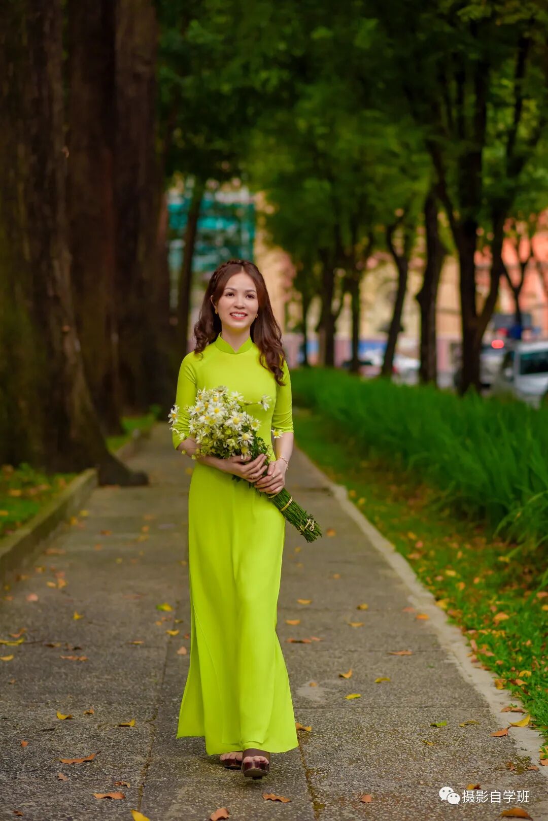我们上面有提到了正面拍摄会给人不够立体的感觉。仔细看图三的画面,虽说是一个正面的拍摄,但是有没有注意到,她在动。腿部的弯曲,足以证明这是在走路的一个姿态,抓拍的姿势。这样走路的动作,给画面增添了动感效果,手里捧着花,可以避免手部没有地方放的尴尬。