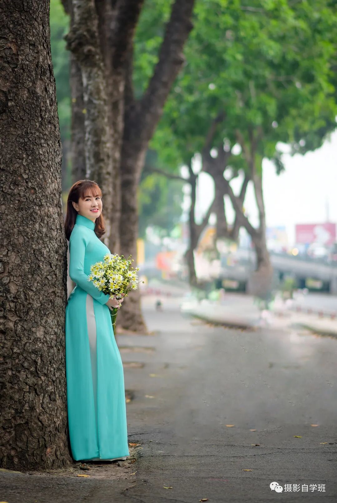 注意人物的拍摄姿势,并没有实打实地依靠在树上,而是我们拍摄这样的姿势时,尽可能地吸气收腹,这样能使人浑身通透,舒展。在吸气的过程中,按下快门,会拍摄出自信满满,精神充沛的人像。