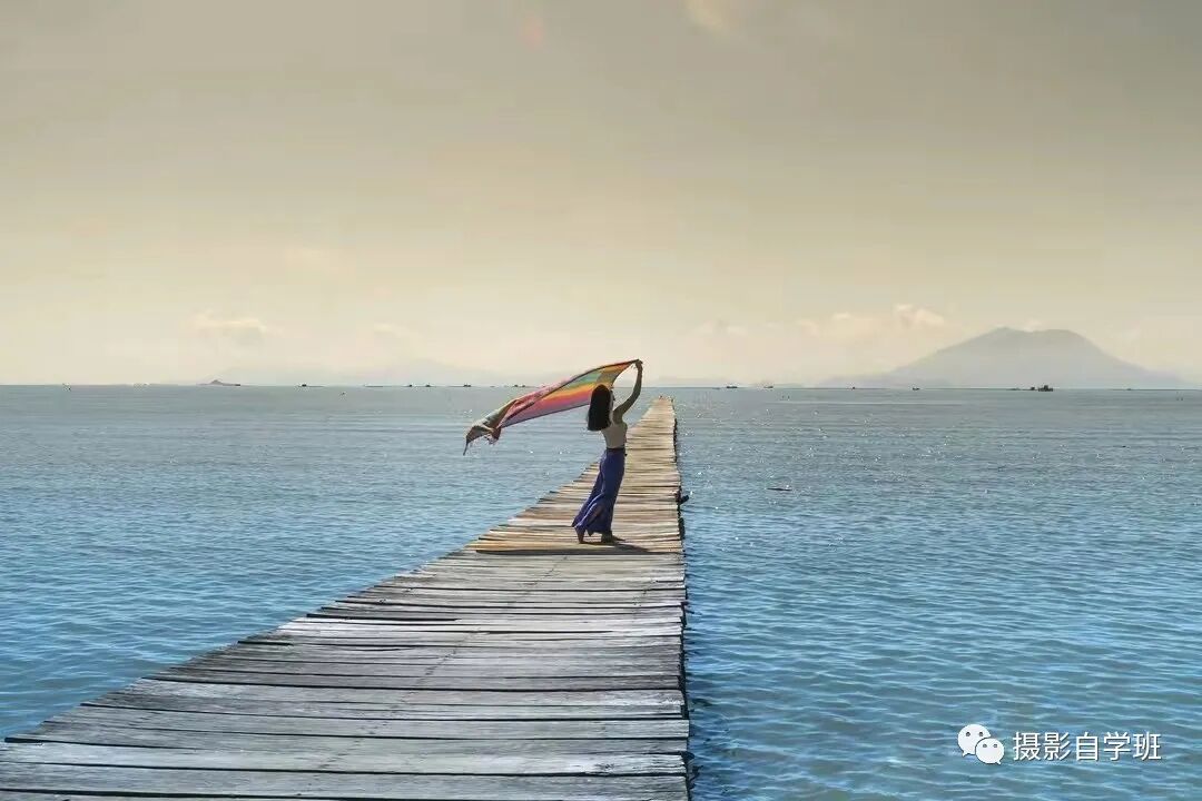 如果想豪放一点,拍出来活泼开朗的感觉,那就在有风度天气,像图6这样,把围巾举过头顶,大风一吹,围巾一飘,照片活泼又好看。如果有长桥,不要忘了,顺着长桥拍摄,照片姿势优美的同时,画面的纵深感,也有了。