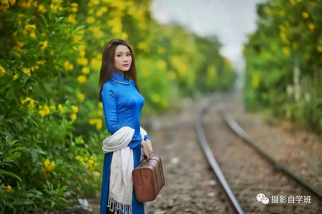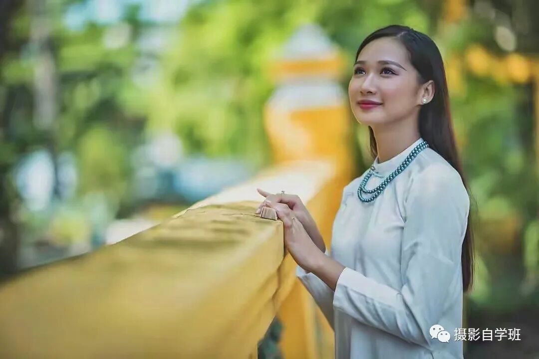 摄影摆姿势,要会举一反三,手没地方放,不只可以摸着花,还可以利用好身边任何景物,比如像图3这样,身边有栏杆的时候,把手搭在栏杆上来一张,姿势不僵硬,手的位置也很合适。把相机放到栏杆上,顺着栏杆向前拍,照片看起来更有空间感,画面更加立体。