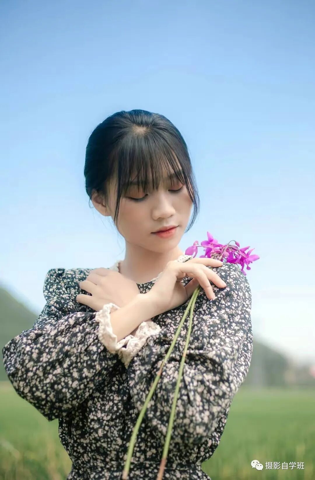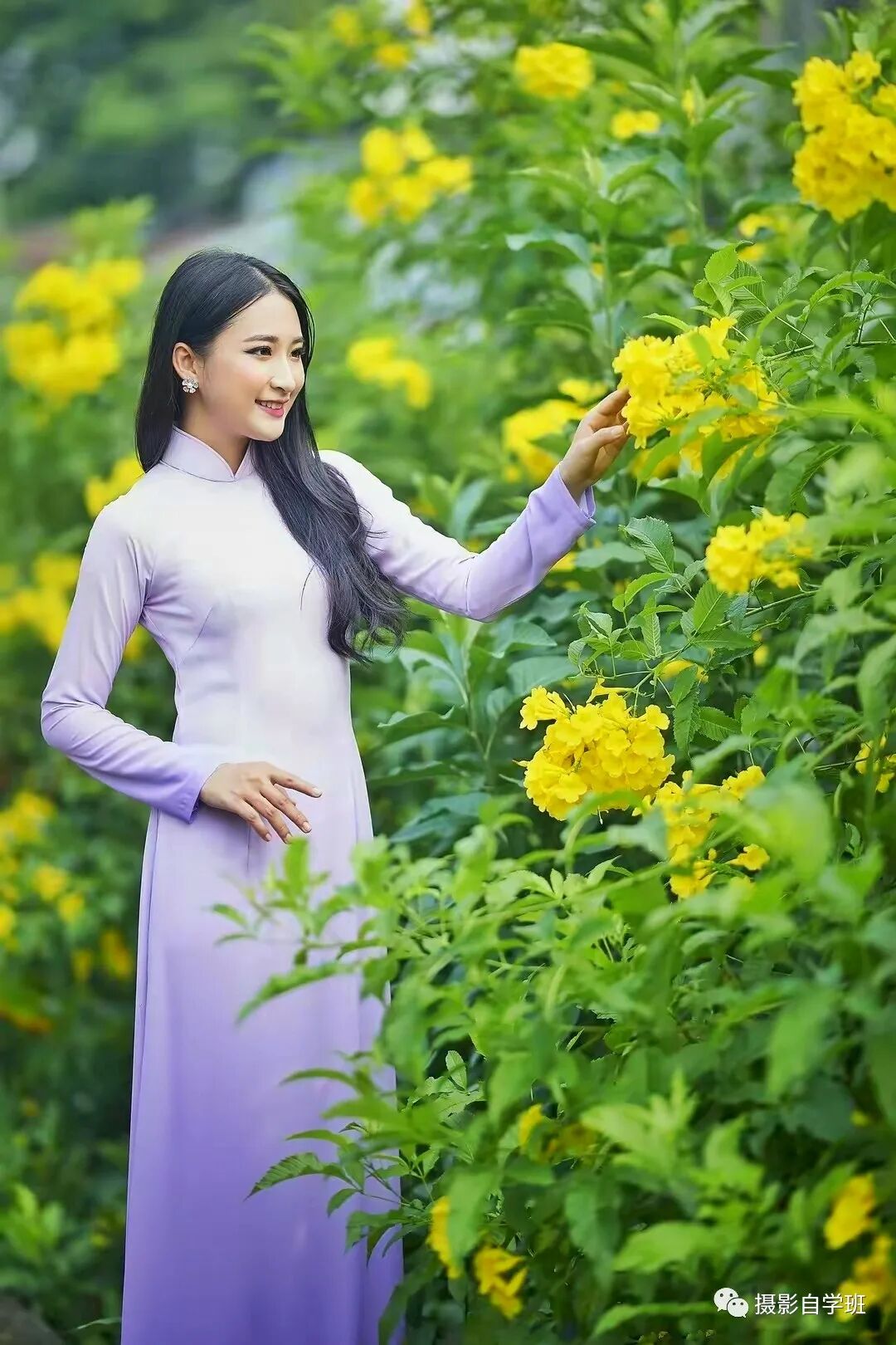 摆姿势想自然,动作就要随意一些,别太夸张,幅度别太大。这个技巧,尤其适合周边有花的时候,随便抬起手,摸着花,来两张,姿势自然协调。但这里要注意人的站位,像图1这样,人不是太居中,在右侧三分线处。像图2,人在左侧二分之一处,拍摸花姿势,人不居中,照片看起来更优美一些。