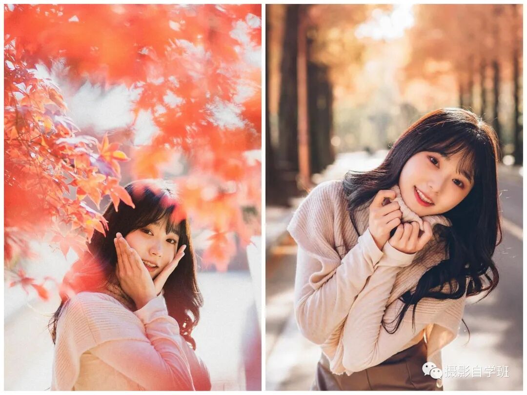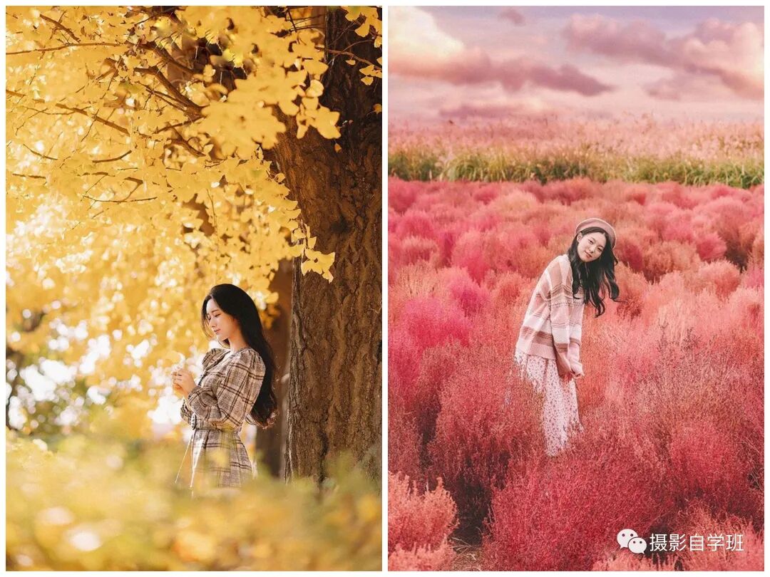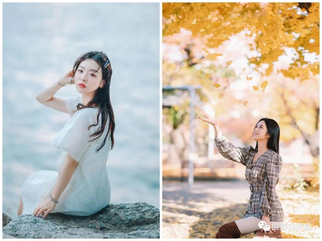 摆姿势,记住“互动”这两个字很关键,坐着的姿势,也可以和镜头有所互动,像上图左侧这张一样,坐姿回头看镜头。或者向上图右侧一样,坐在那里手和景物互动,好似在托起落叶。坐在那里无论是和镜头互动,还是和身边的景物互动,都可以让你的姿势看起来更加协调、自然。