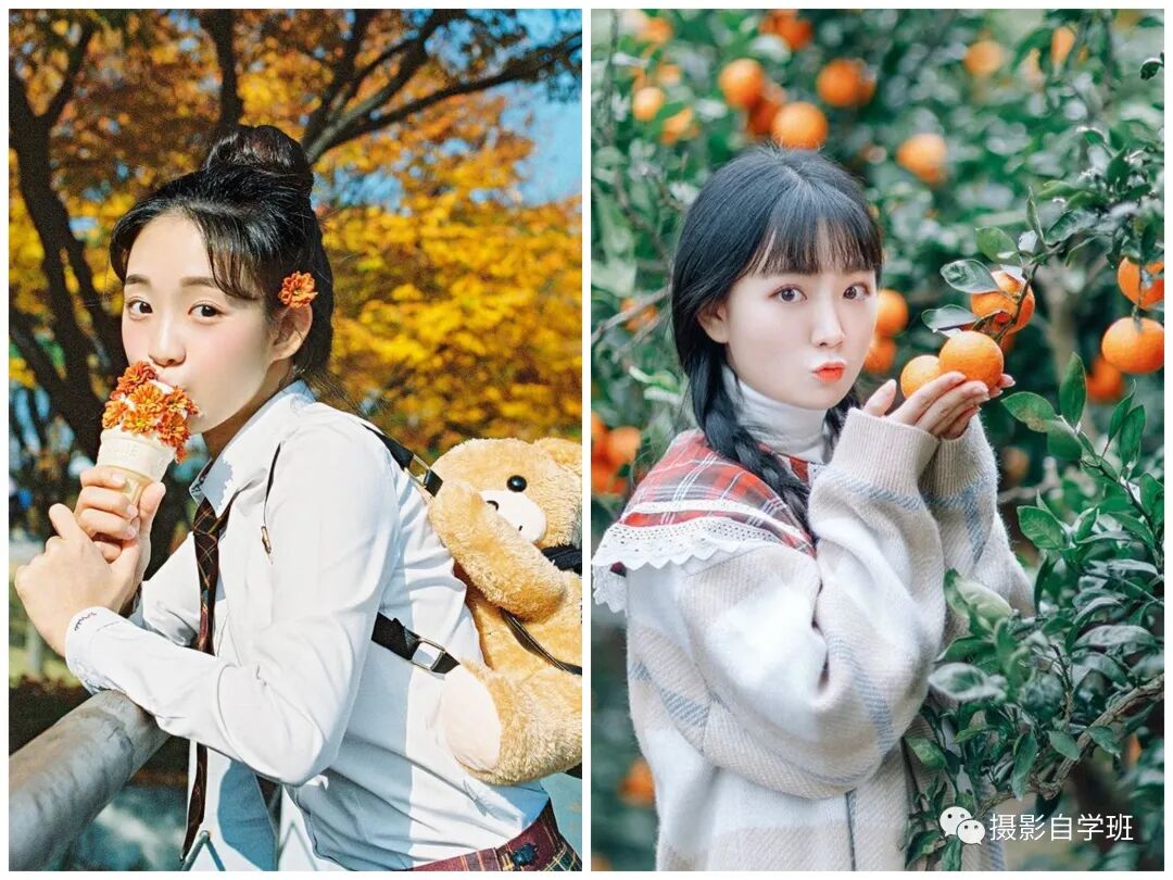 如果拍照时,没有好的表情,可以准备一些食物,像上图左侧这样,人与食物进行互动,表情就有了,或者像上图右侧这样,嘟起嘴,做一些可爱的表情也很不错。