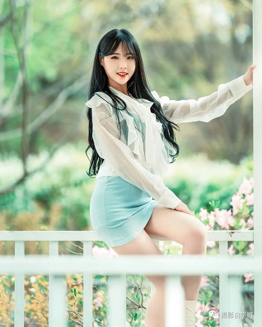 在室内拍照片的时候,如果手中,没有什么东西拿着,可以再把腿弯曲,坐着的同时,两个手抬起来,交叉放在脖子前,在身后埋一个闪光灯,就可以拍出头发上的轮廓光了。但是,上头这种坐姿,看起来并不是十分舒适,有一点别腿,如果腿部像下图这样,在室外,自然向前伸,看起来,就会舒适一些。两个手,还可以放到身后撑着地。