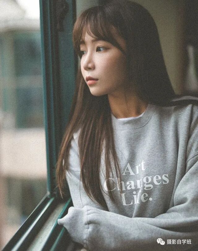 室内摄影,最好用的摄影技巧,就是在窗口边拍照,因为窗口光,可以给人的面部进行补光,同时因为画面当中,有比较大的光比,人的脸比较亮,背景比较暗,脸部的亮,可以让人更被突出,背景的暗,可以让画面看起来更显整洁,同时画面当中,有了明暗对比,主次就更加明显,画面也会更有张力,更有情绪感。两个手,可以一只自然地搭在窗户上,手部的摆姿确定之后,一定要注意,眼神的方向,眼睛可以看向窗外,若有所思的样子,增加照片的故事感。